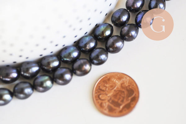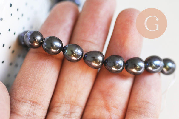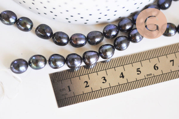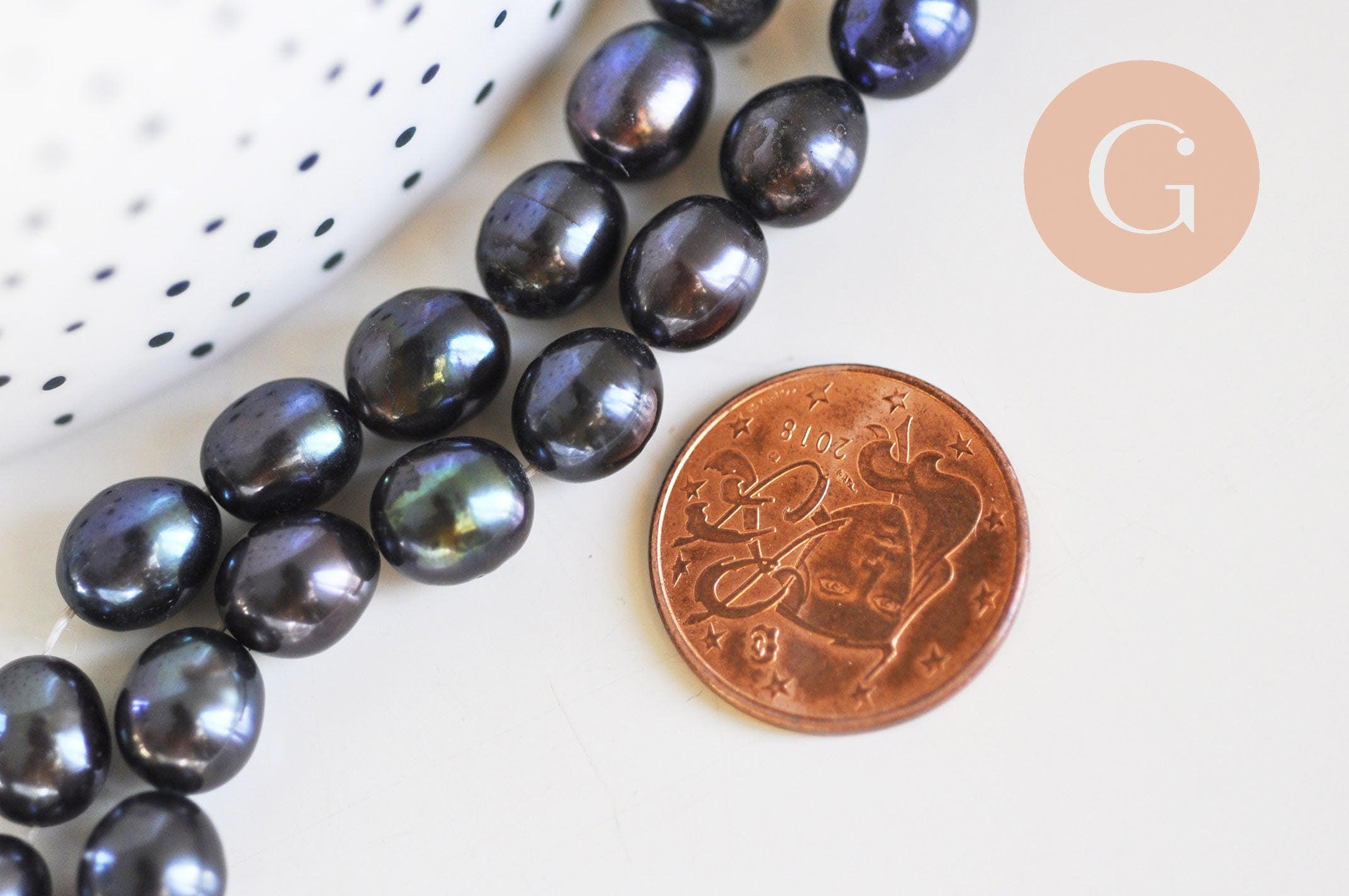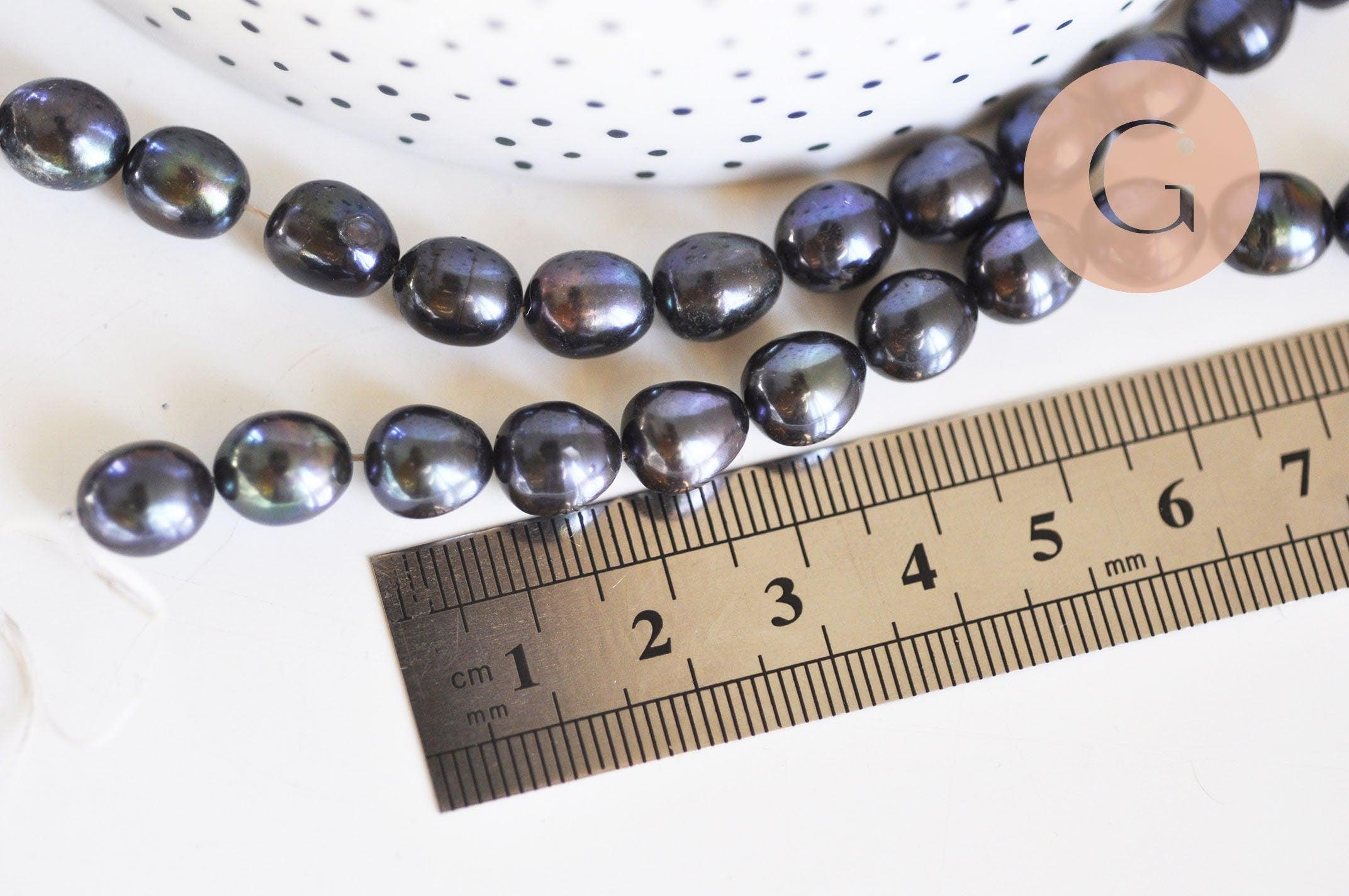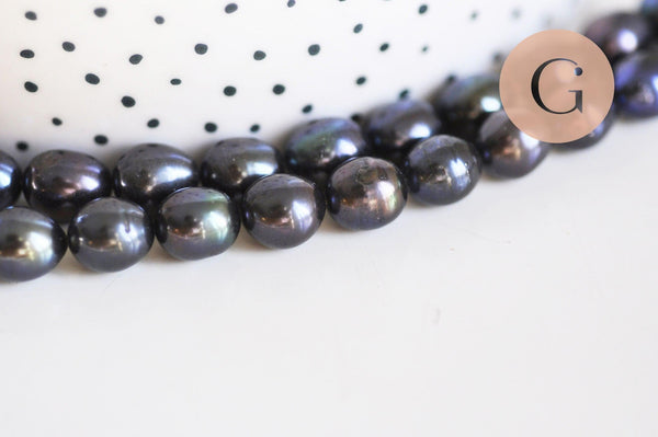 Hermosas perlas de agua dulce negras ovaladas naturales de calidad, vendidas por hebra de aproximadamente 15-18 perlas (18,6 cm de largo).