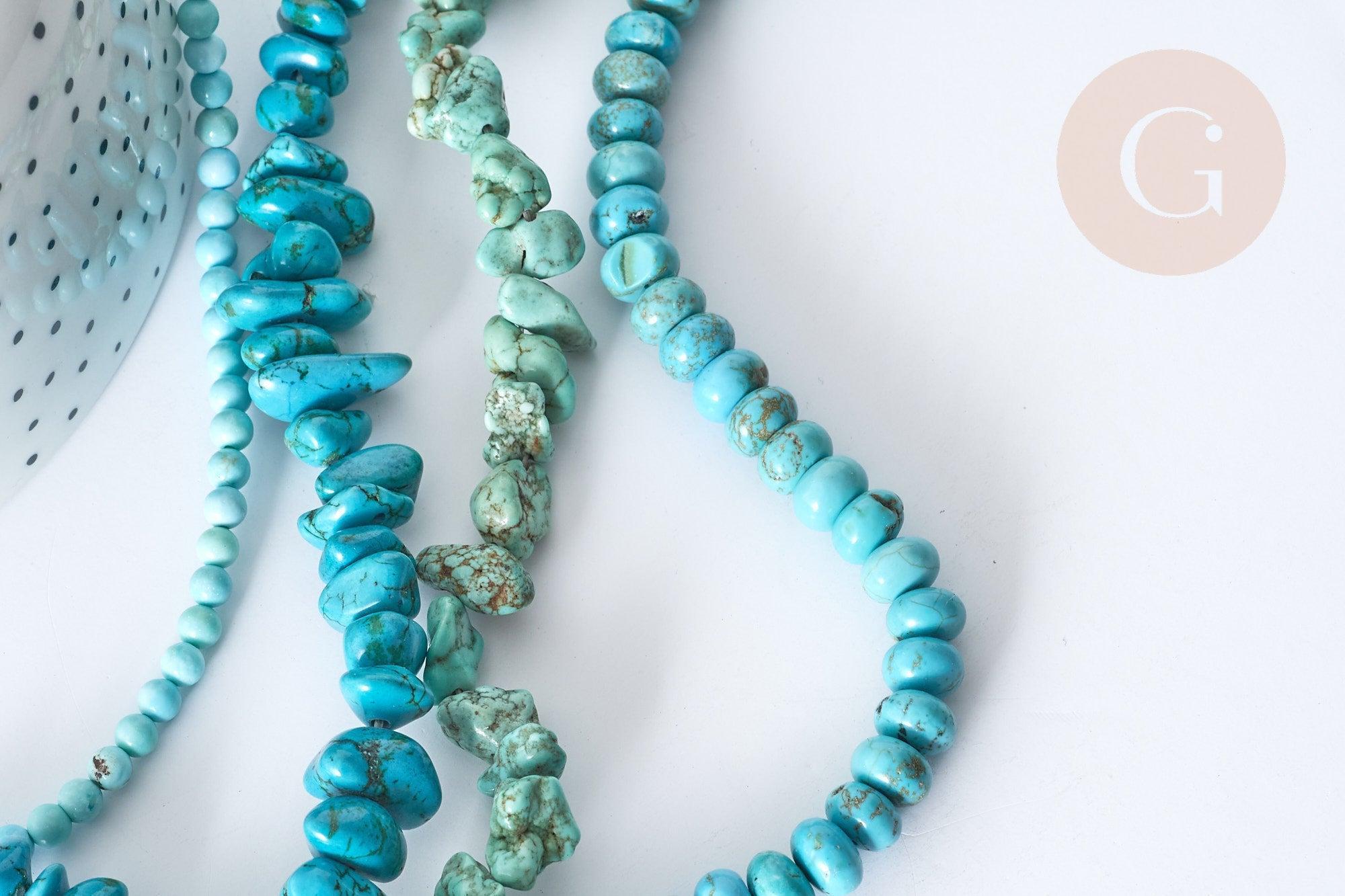 Estas cuentas de joyería de howlita teñidas de forma natural te permitirán crear joyas únicas y originales. Son de color azul turquesa y las formas disponibles son pepitas, arandelas o cuentas redondas.