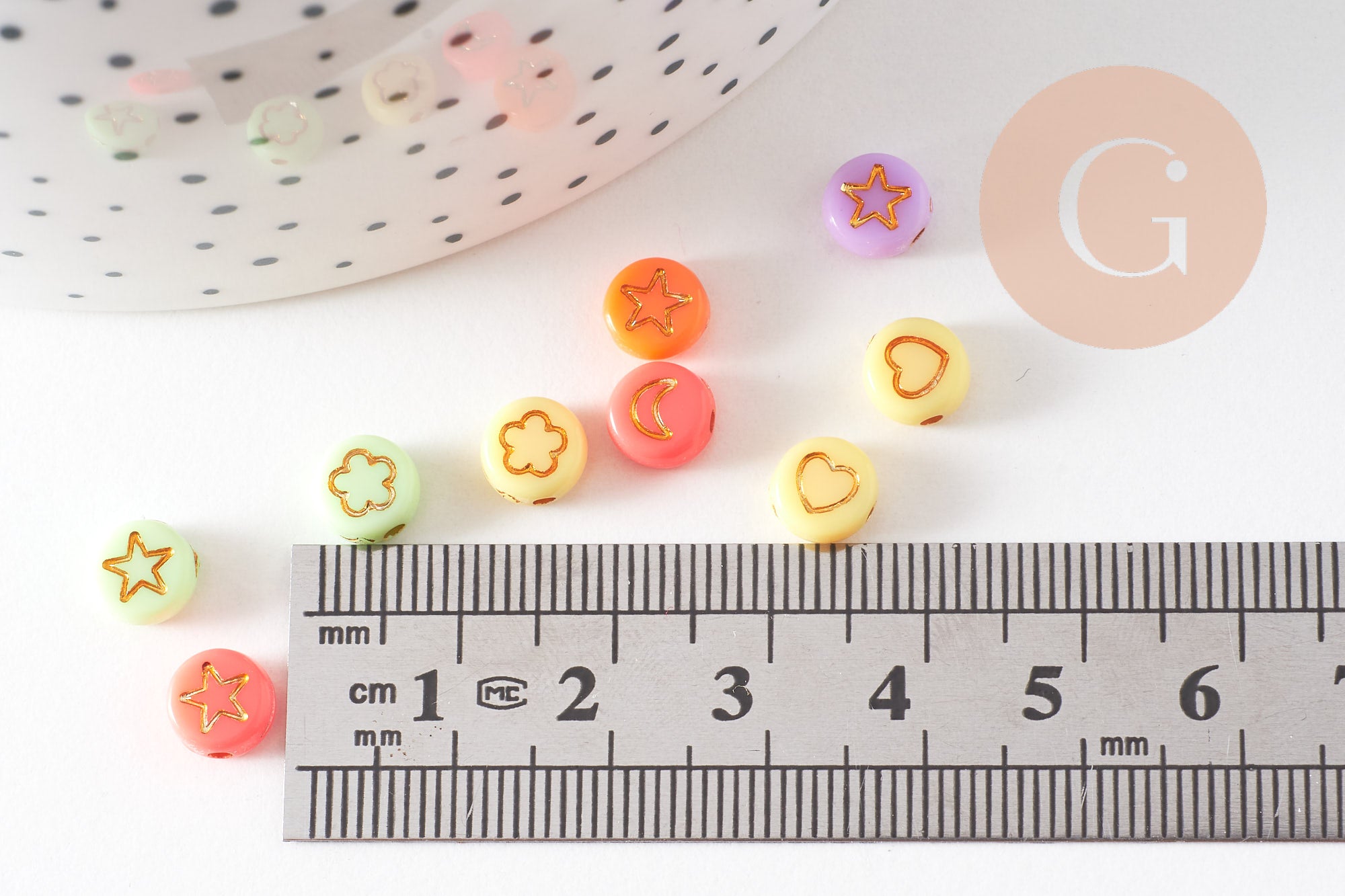 Dale un toque divertido, dulce y colorido a tus creaciones con estas cuentas redondas de plástico en tonos pastel con bonitos símbolos dorados. Luna, estrellas, flores o corazones: cada cuenta es la sorpresa perfecta para crear joyas alegres, infantiles o retro.