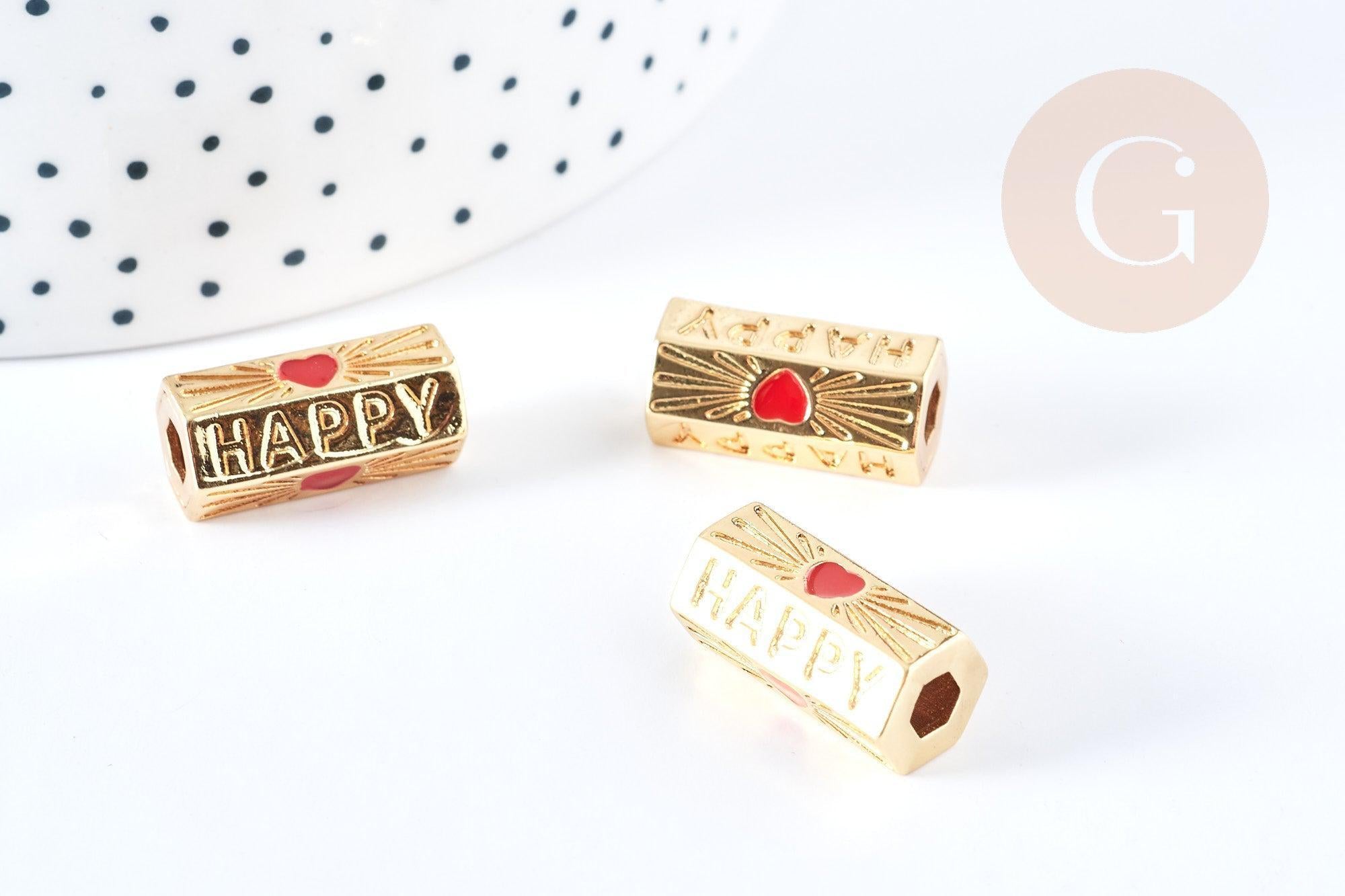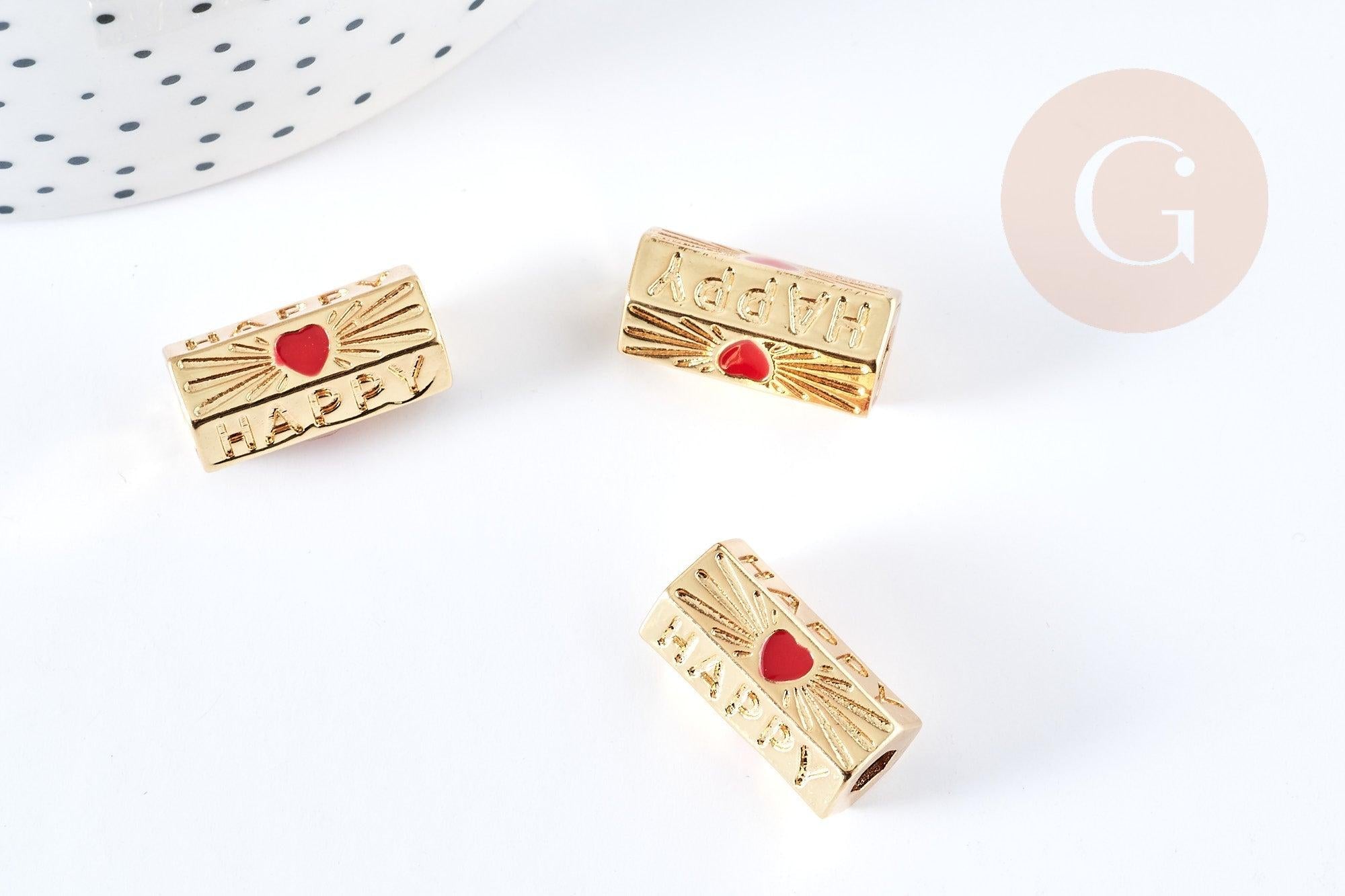 Perle tube talisman message HAPPY doré couleur rouge 21mm, perle dorée bijoux amour, x1 G7671