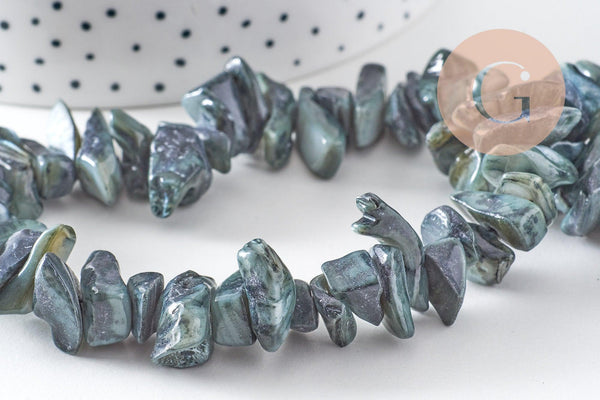 Aproximadamente 75 perlas de chips de concha teñidas de gris.