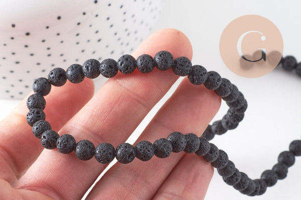 Perle ronde en lave noire naturelle 6mm, x1 fil de 39cm (G1571)