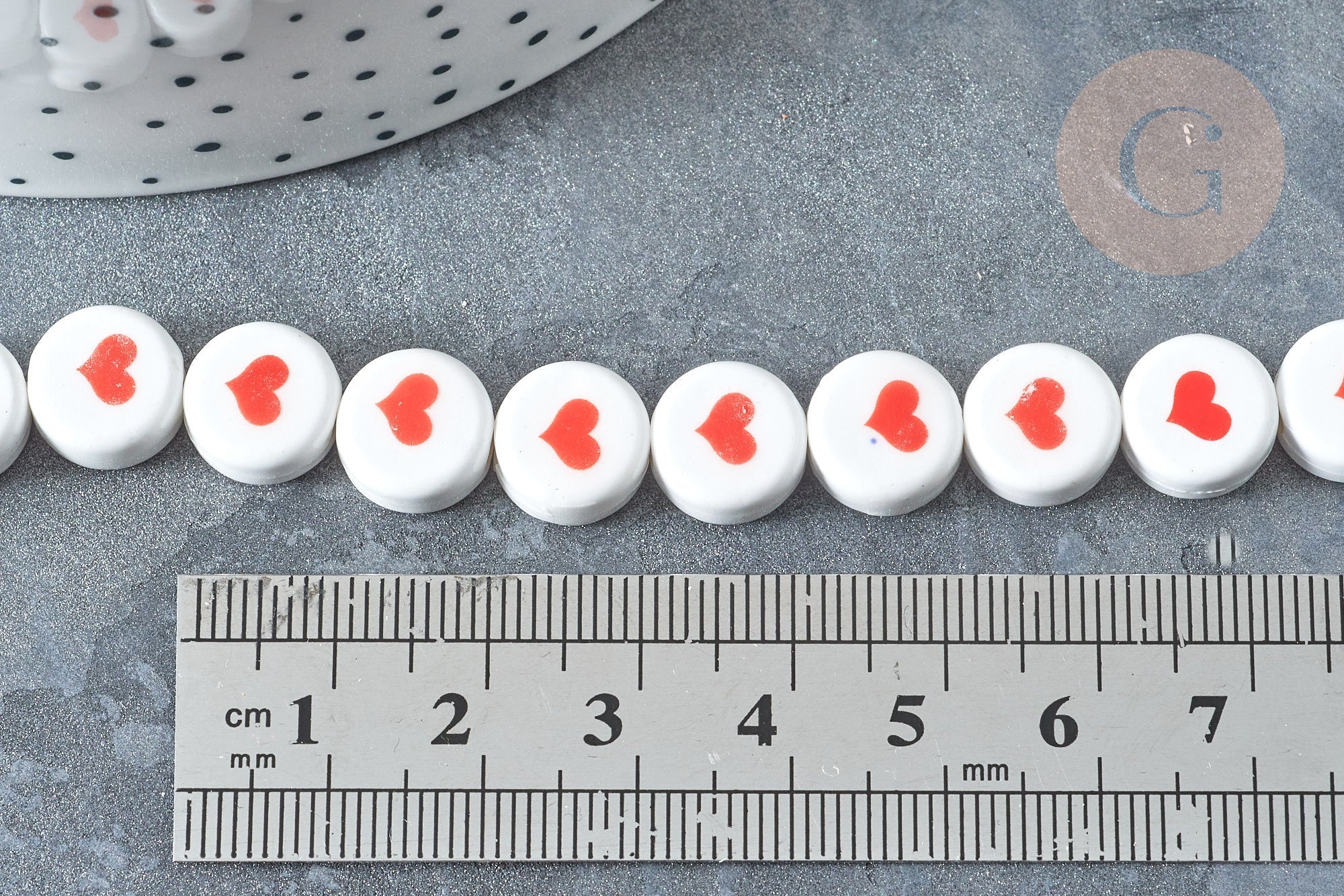 Crea un montón de bisutería DIY con estas cuentas redondas planas de porcelana blanca , compuestas por un corazón rojo .
