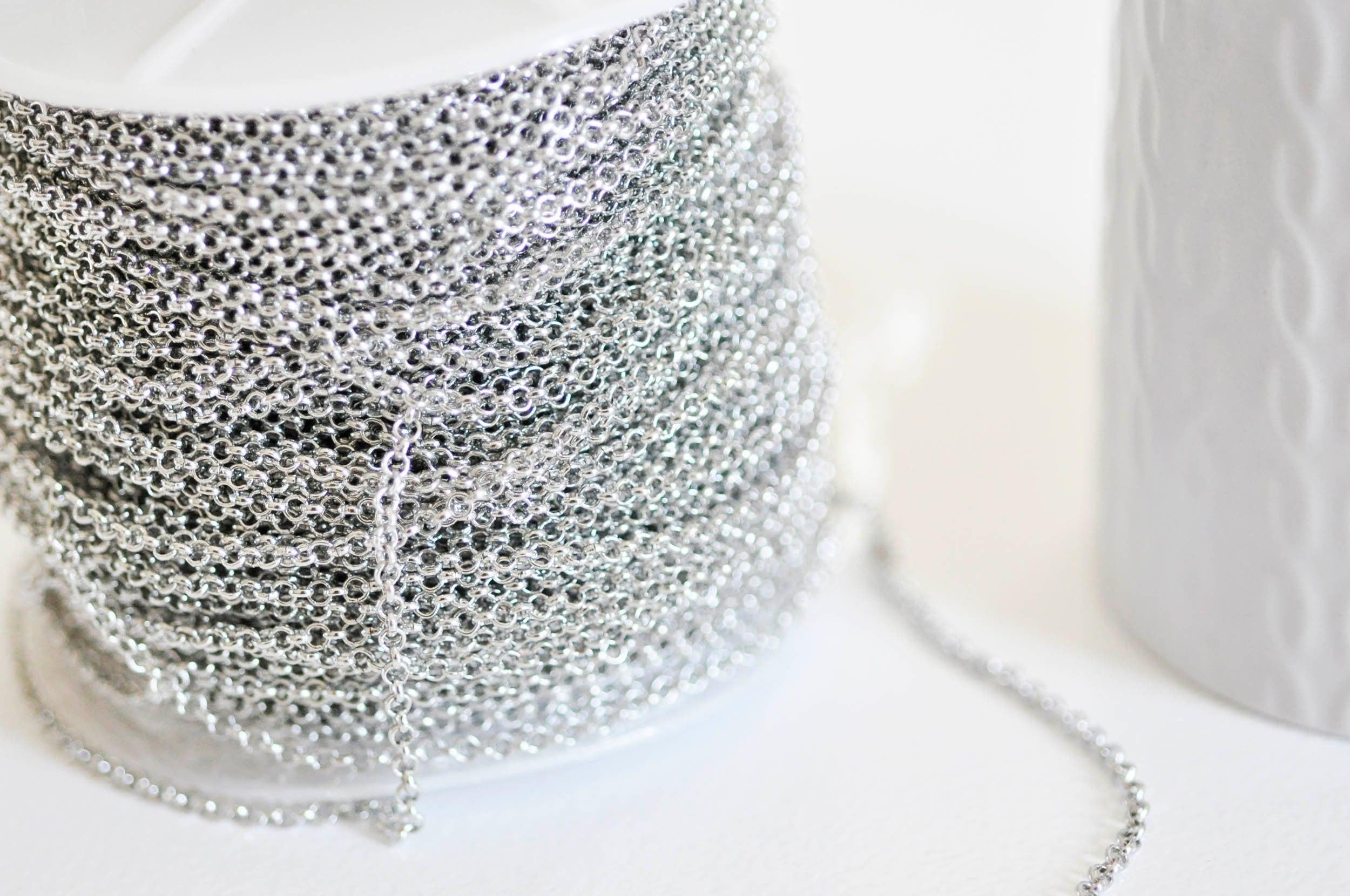 Cadena metálica plateada con malla enrollable, disponible en paquetes de 5 metros. Ideal para crear collares, pulseras, collares, pendientes y demás bisutería. Imprescindible para tus creaciones DIY, ¡sin límites para tu creatividad!