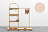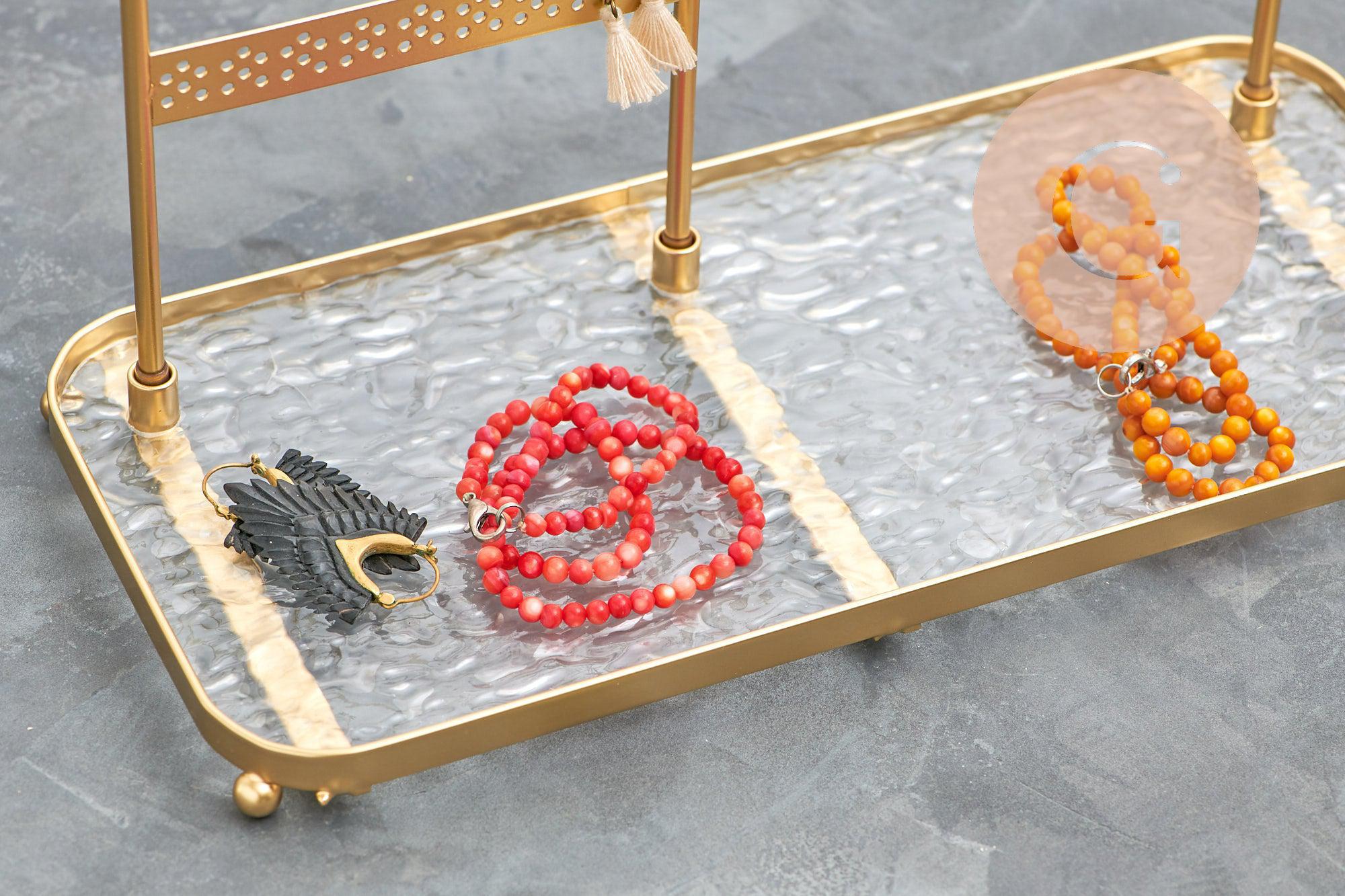 Elegante y sofisticado, este exhibidor de joyas combina una cubierta de acrílico transparente y un marco de hierro dorado, brindando una presentación moderna y chic para sus aretes y collares.