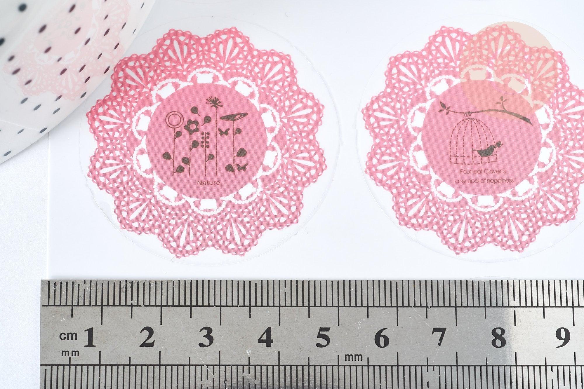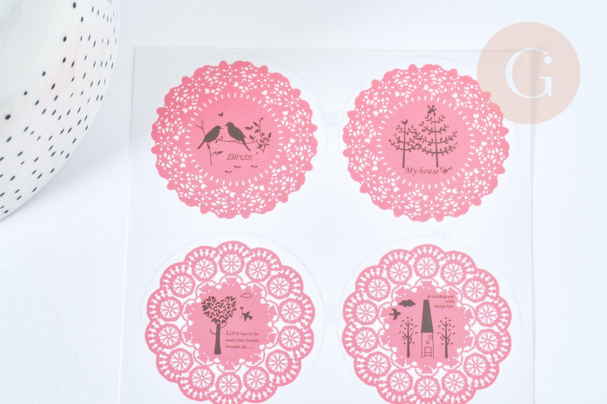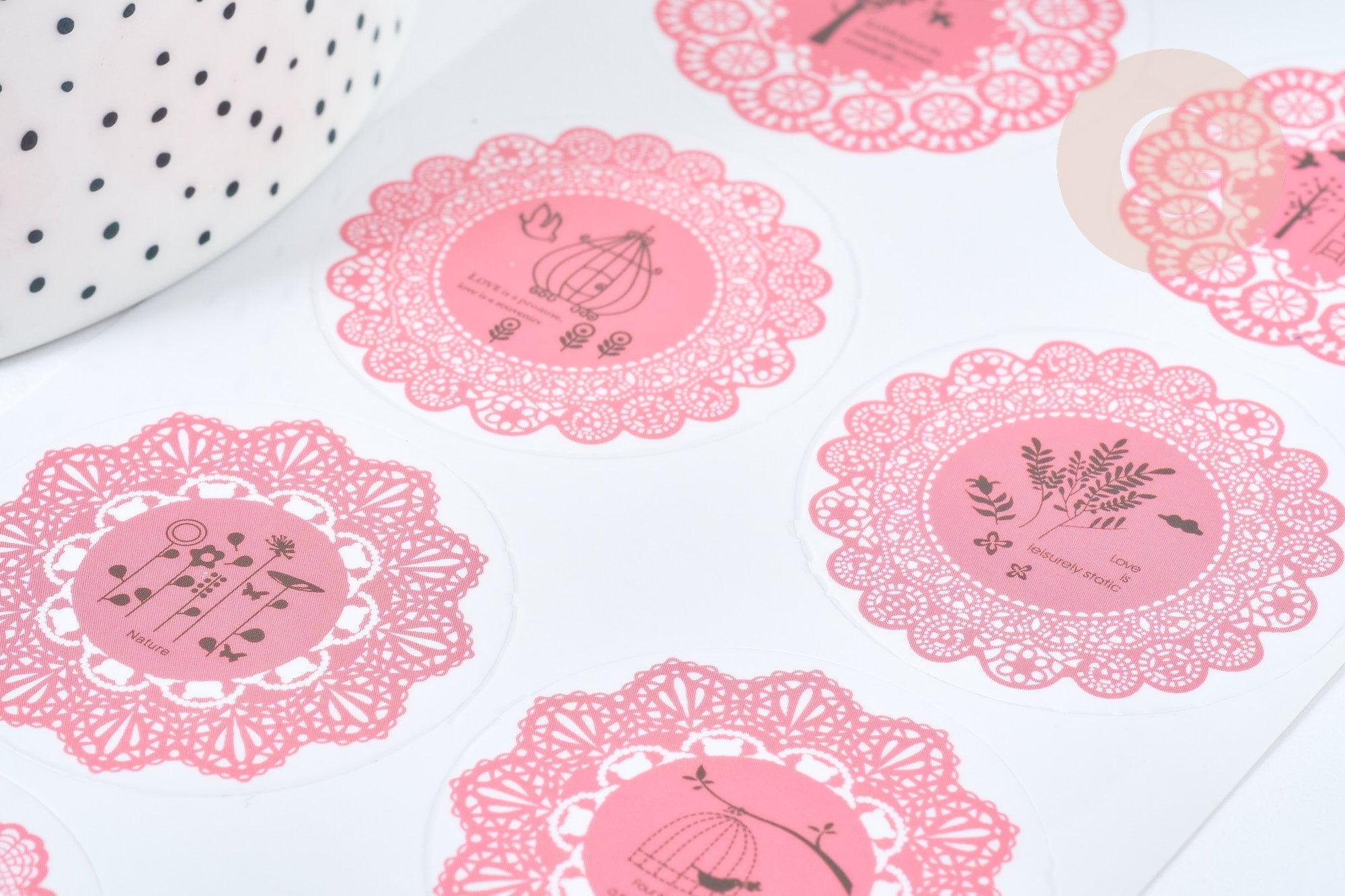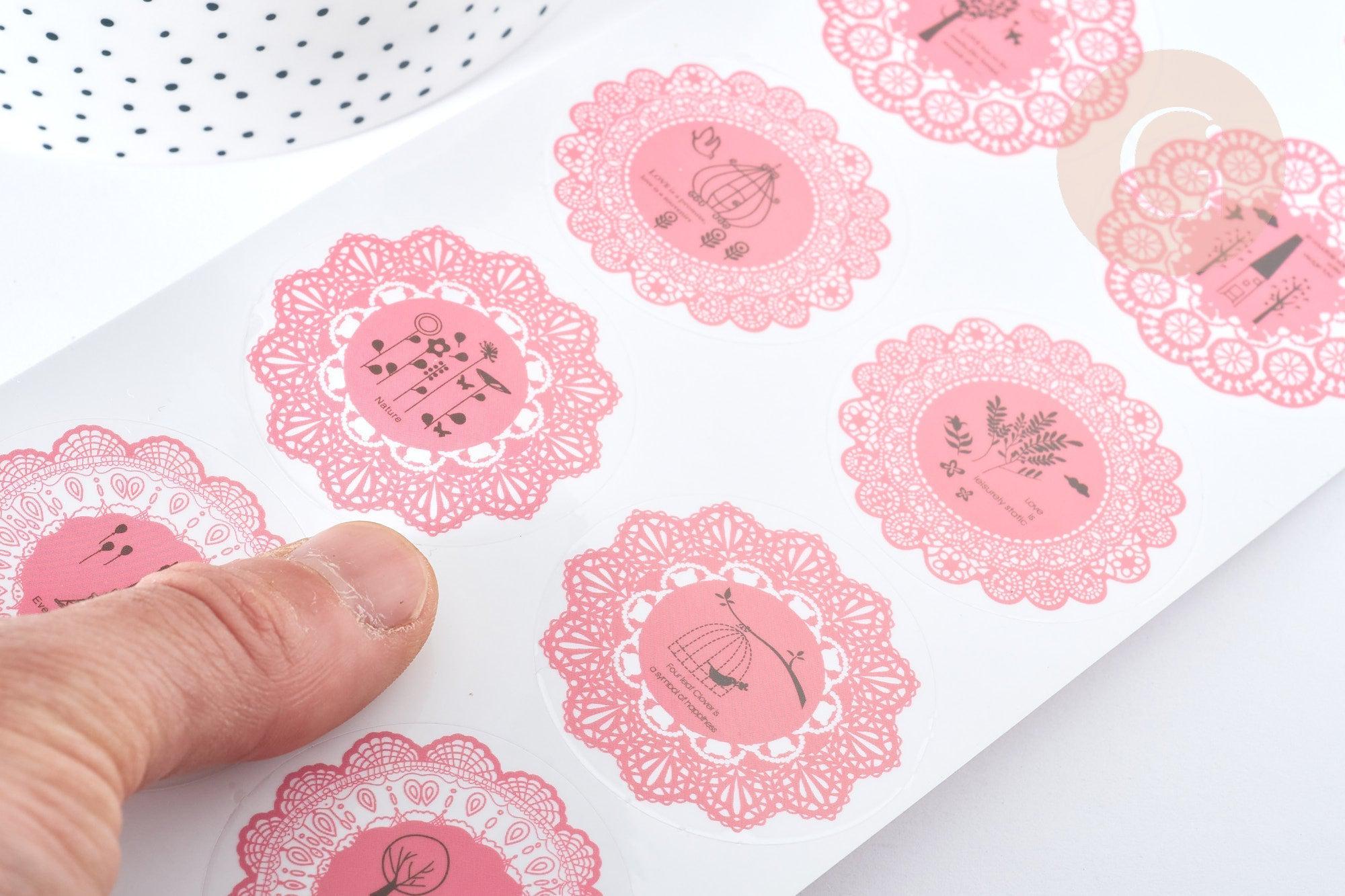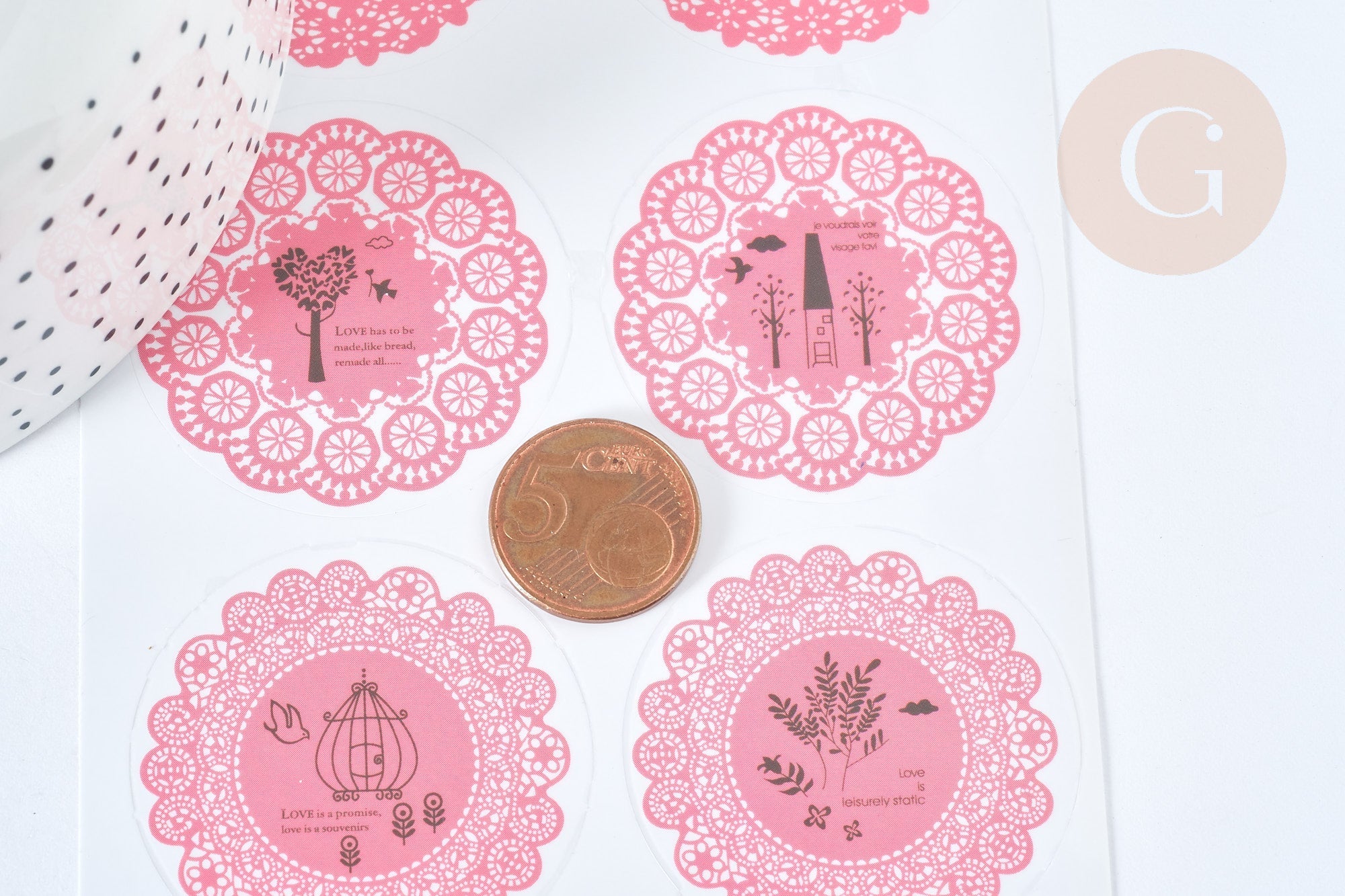Craquez pour ces autocollants roses ronds en forme de macaron de dentelle, en guise de remerciement ou pour la décoration de fêtes ou vos petits cadeaux de mariage.