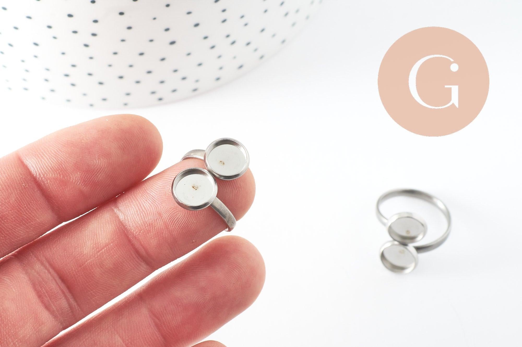 Bague réglable double cabochon rond 8mm acier platine inoxydable 16.8mm, x1 (G9705)