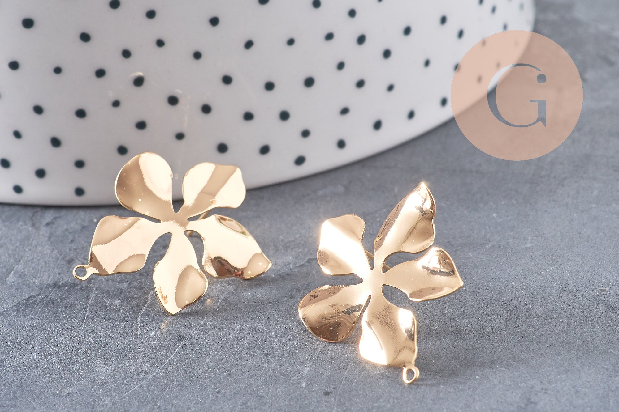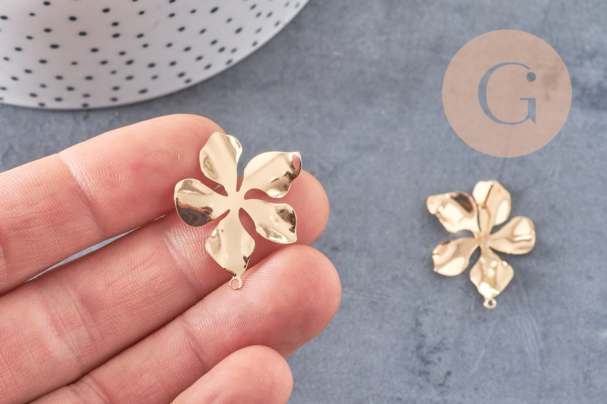 Craquez pour ces clous d’oreilles en forme de fleur XL en laiton doré à l’or fin 18K, au design torsadé élégant et moderne. Ces apprêts hauts de gamme sont sans nickel et prêts à accueillir une breloque ou un pendentif grâce à leur trou de 1.2 mm à la base de la fleur.