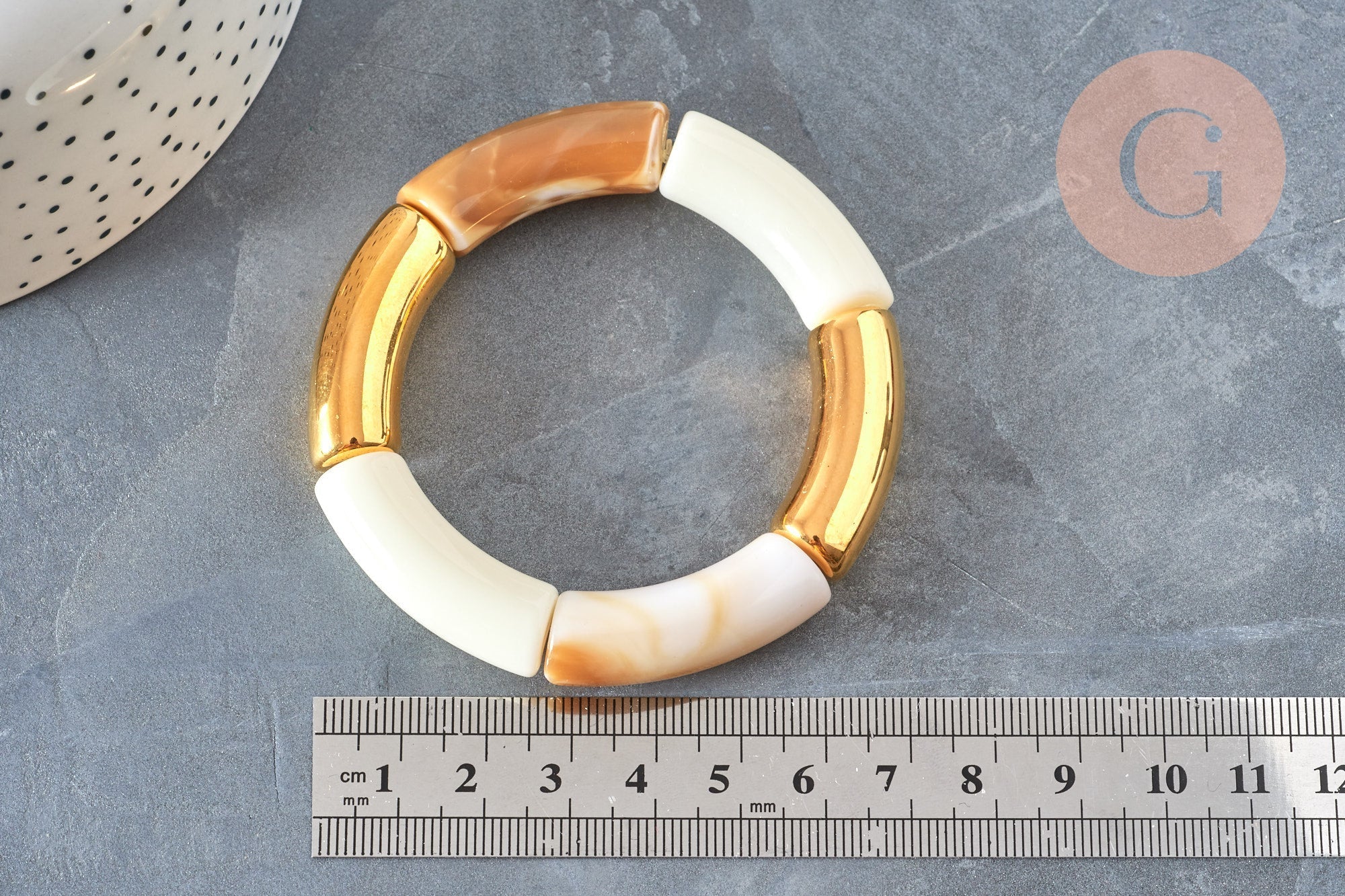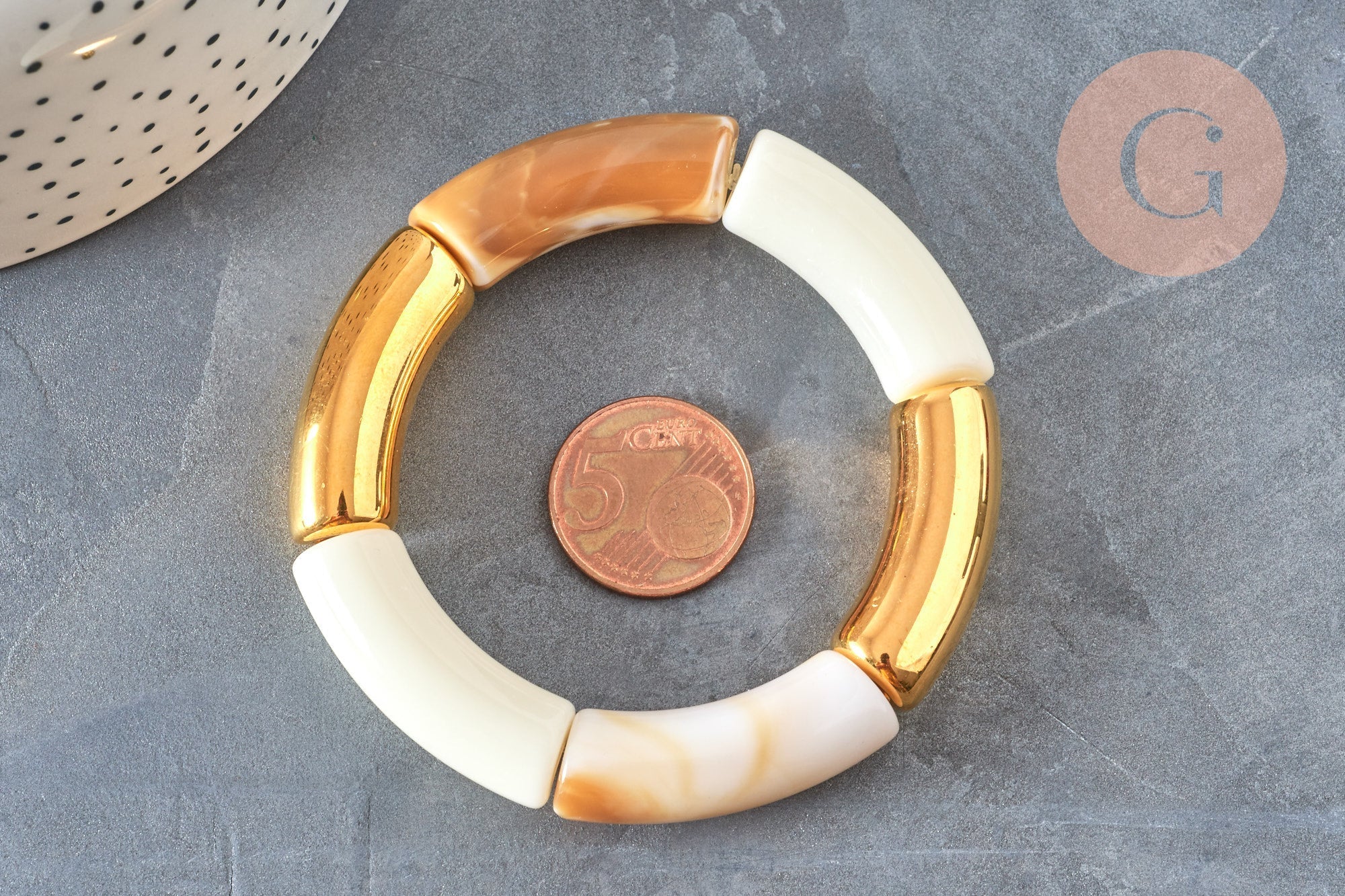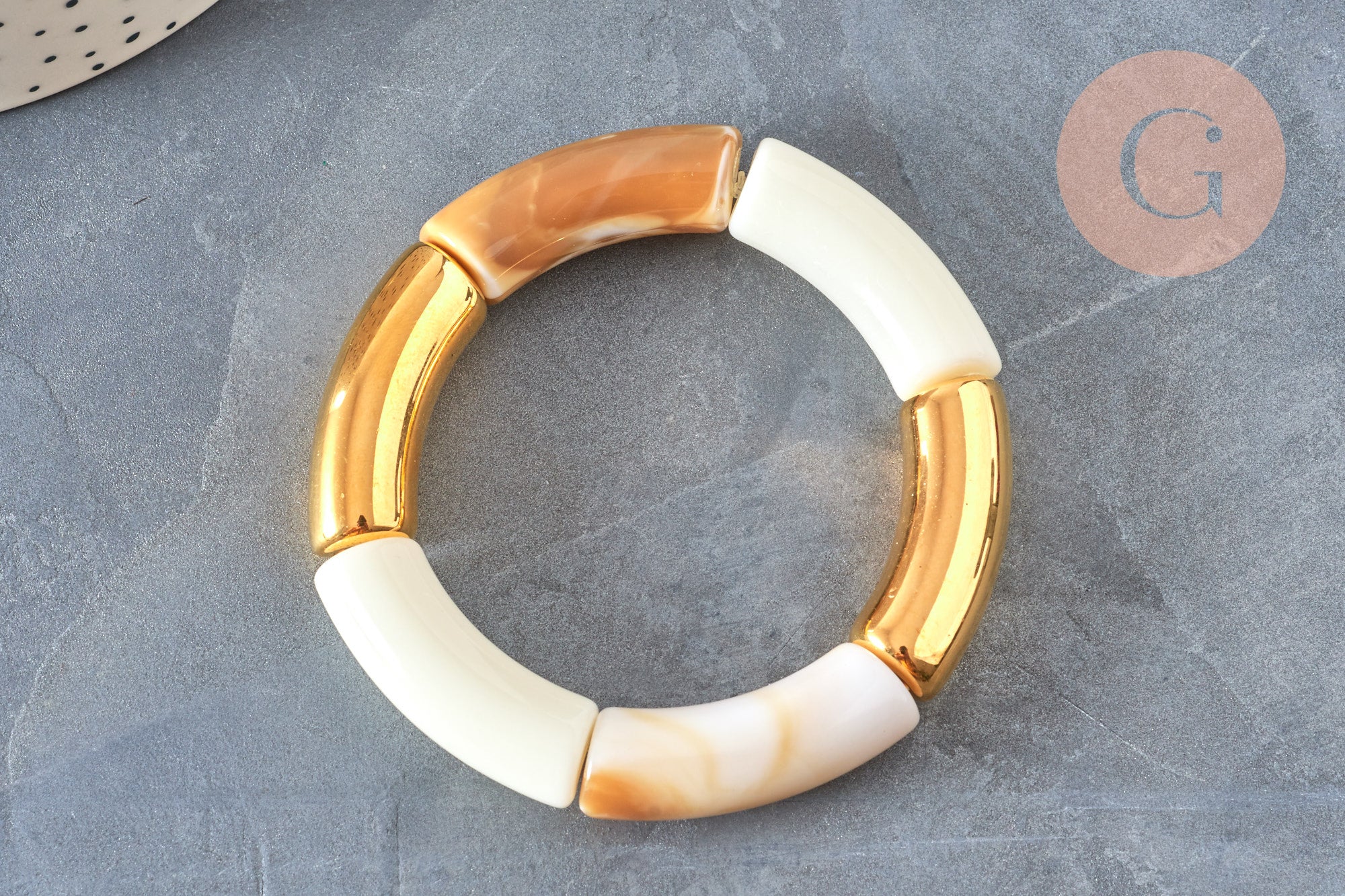 EP-Bracelet jonc élastiqué résine beige et or imitation pierre 50mm, x1 (G6927)