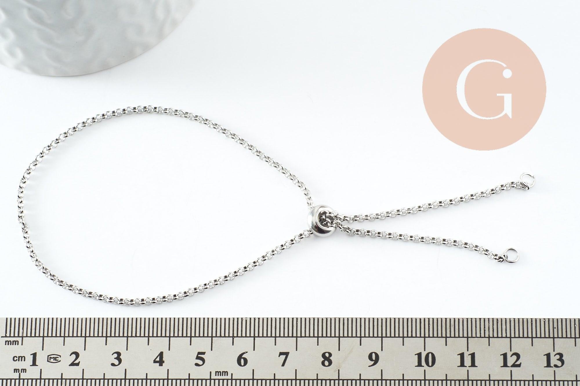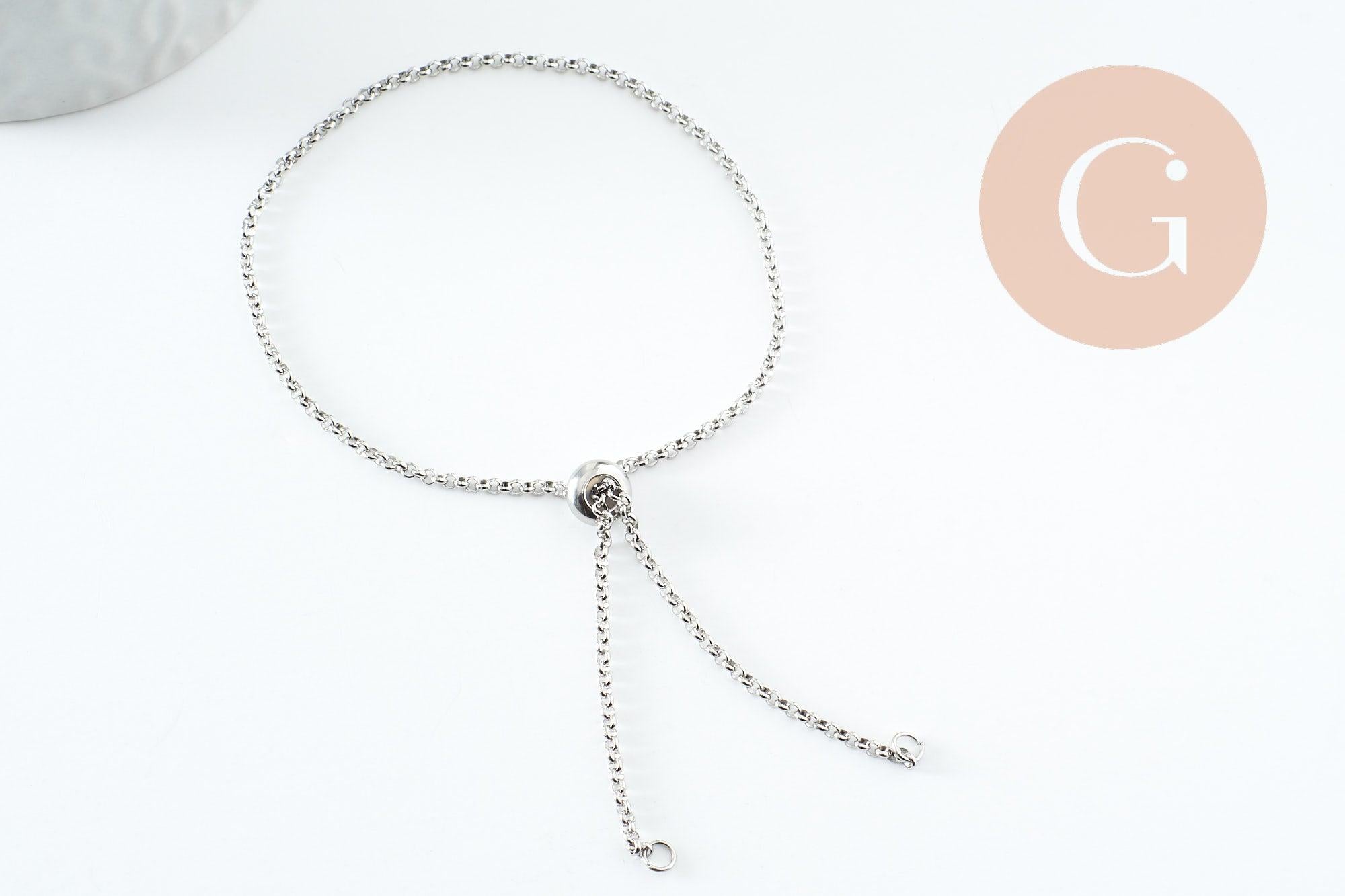 Un bracelet délicat en acier platine réglable grâce à son frein et personnalisable en y ajoutant des perles ou breloques sur les deux anneaux