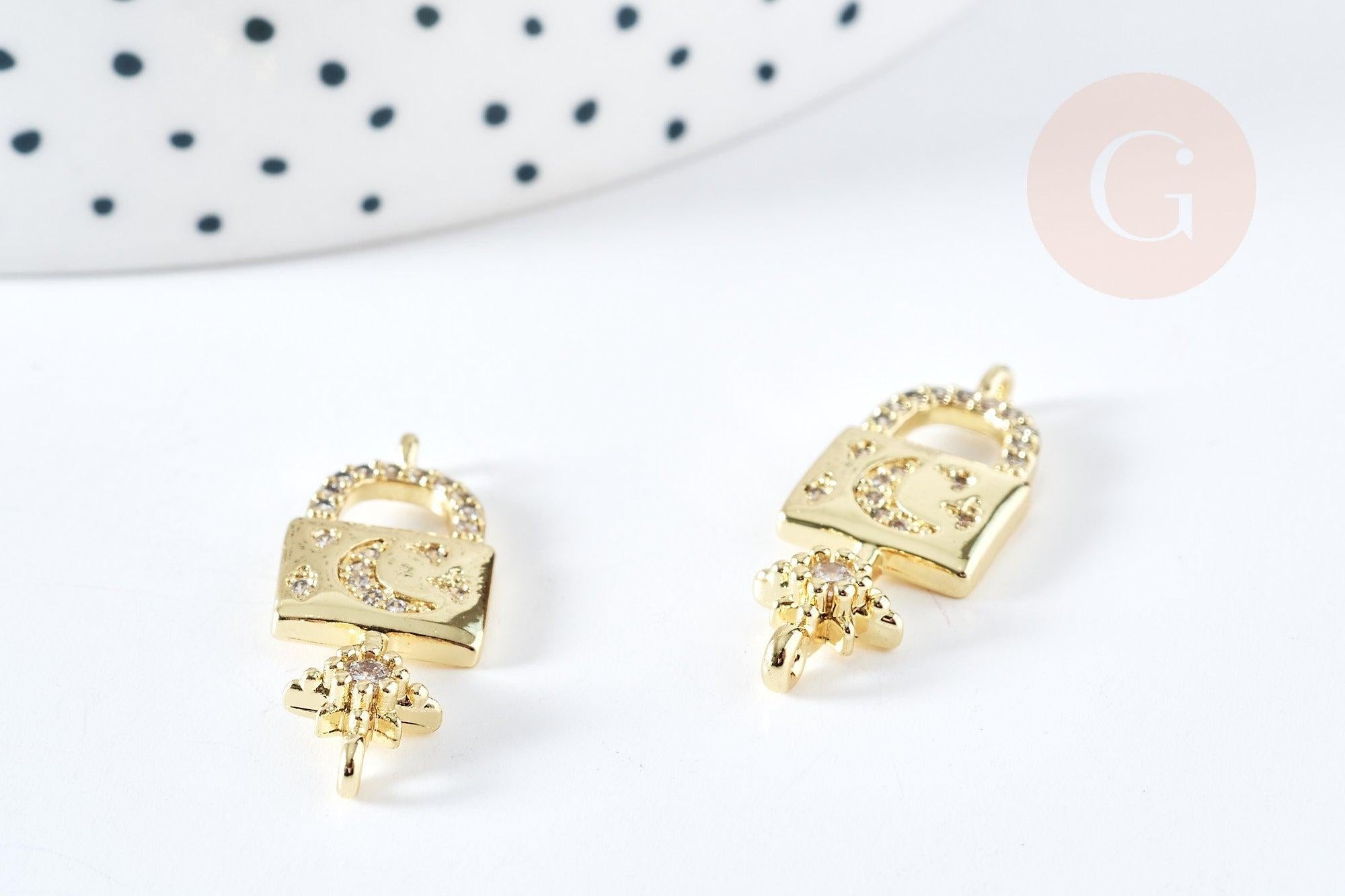 Pour réaliser de magnifiques colliers, boucles et bracelets, adoptez ce mignon cadenas, petit Pendentif d'amour avec sa clef étoile 🌟 porte bonheur en laiton doré, décorée de petits zircons brillants blancs.