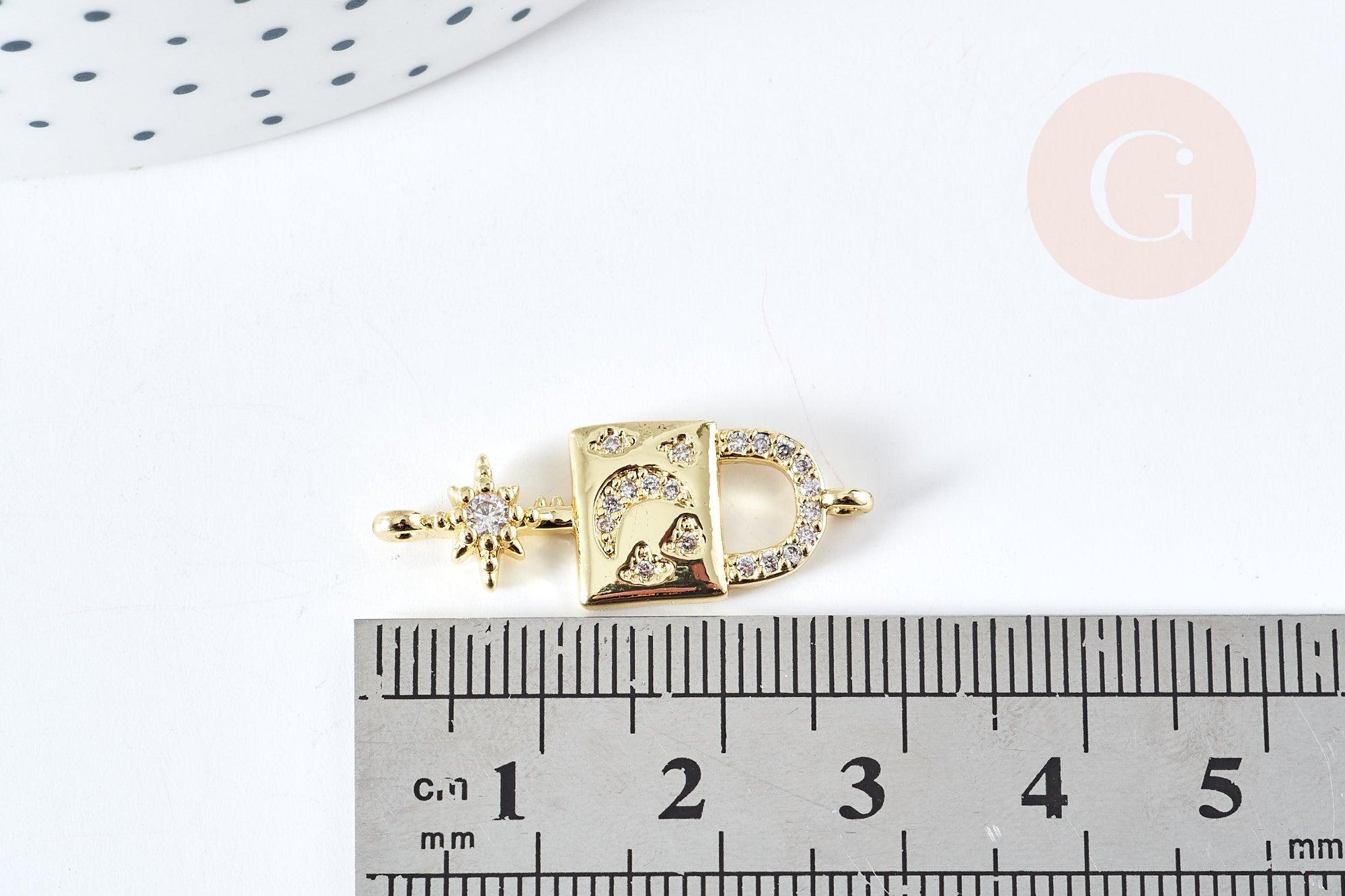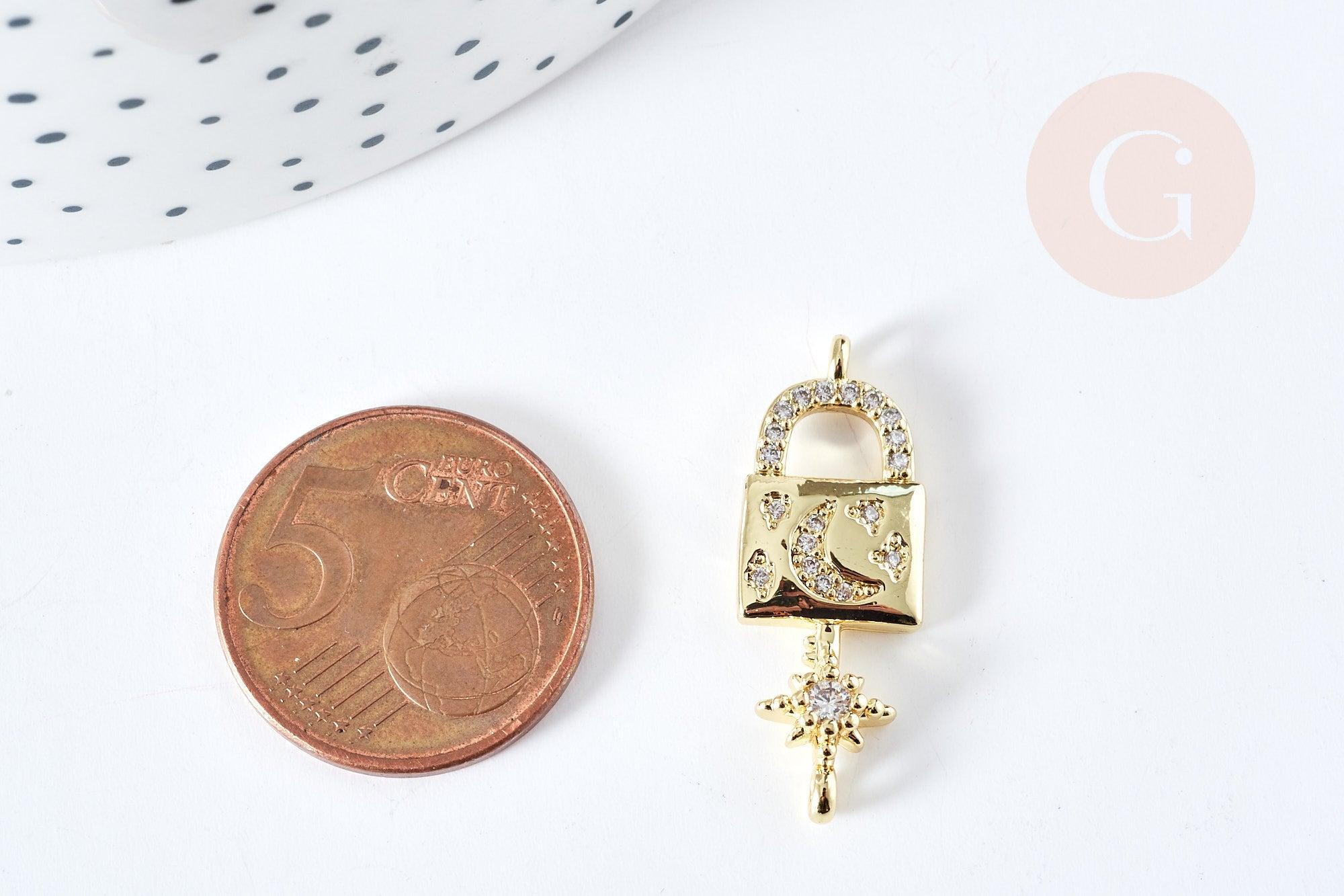Breloque cadenas lune laiton doré 18k cristal,sans nickel,croix bijoux,création bijoux,pendentif amour, Pendentif zircon,28mm
