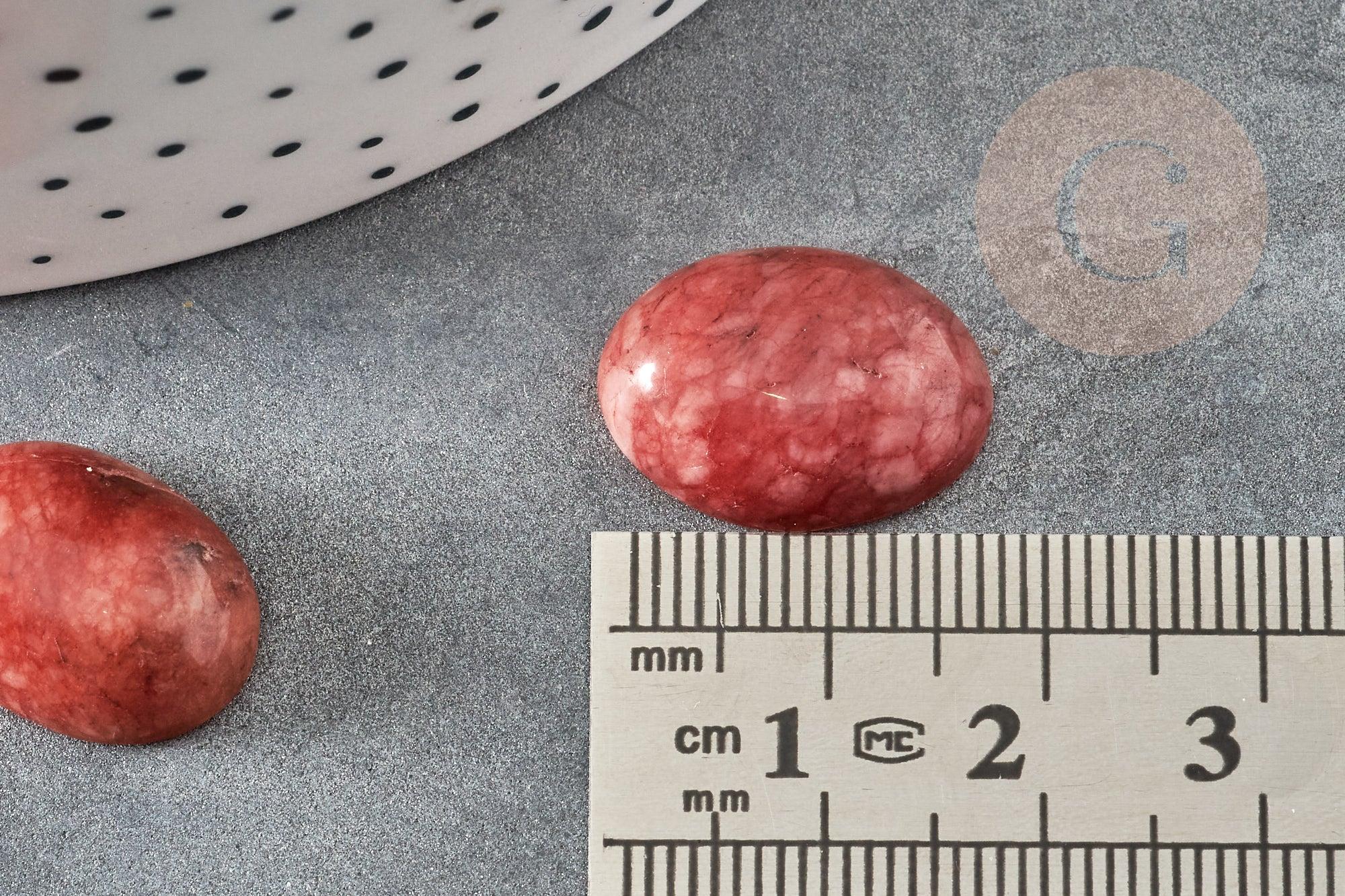 Ce cabochon en jade marbré rouge naturel, de forme ovale (18x13 mm), se distingue par ses teintes chaudes allant du rouge profond aux nuances plus claires marbrées.