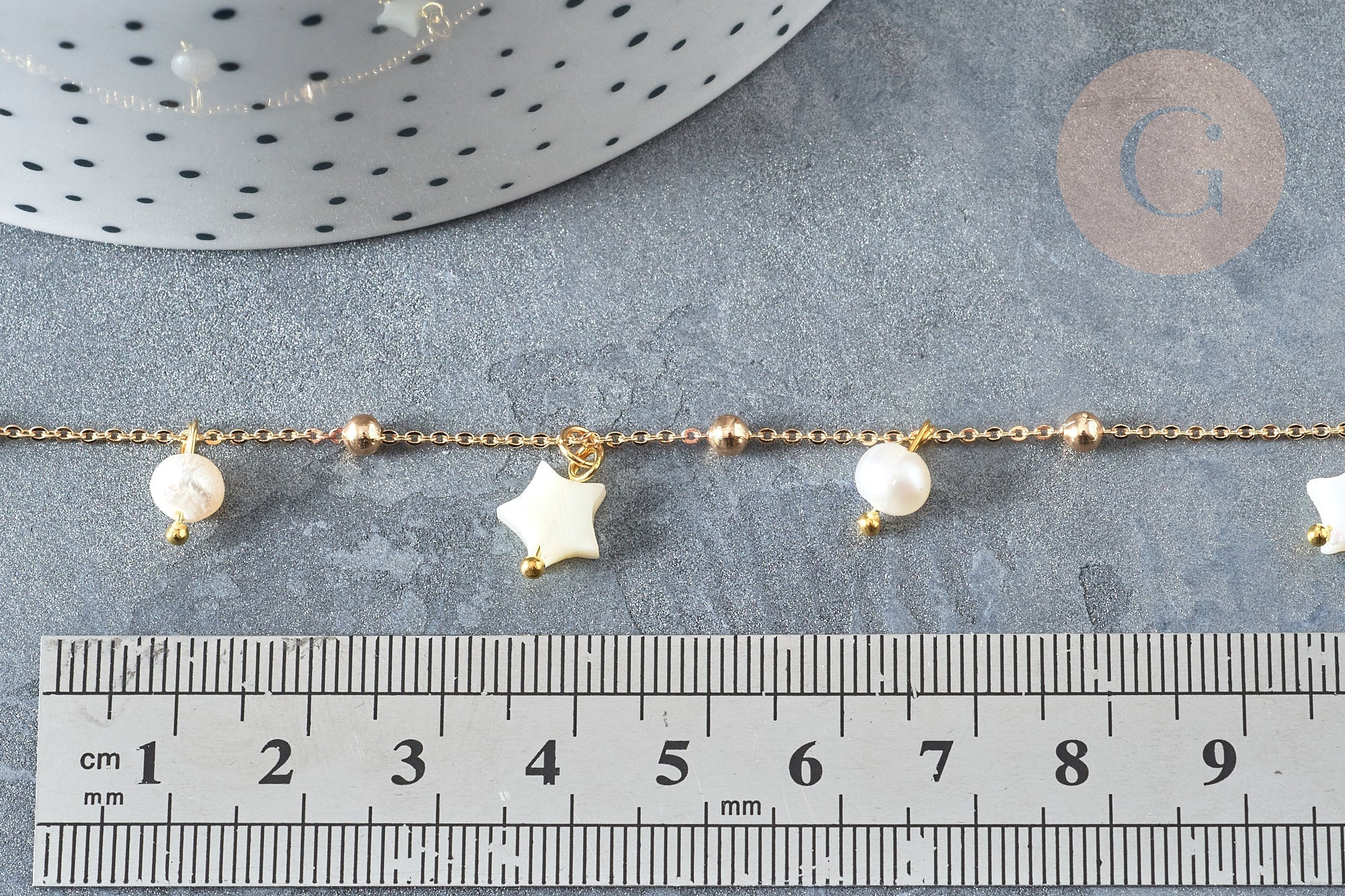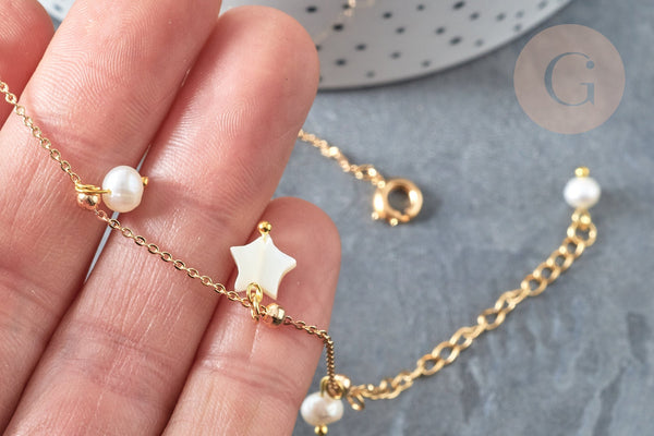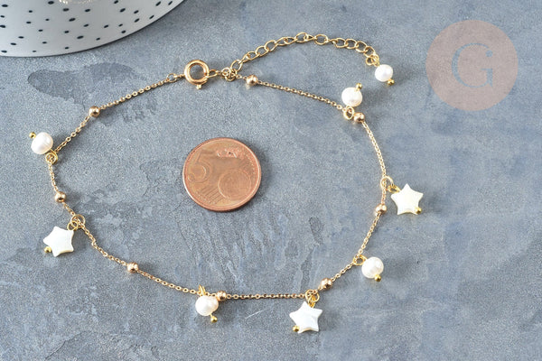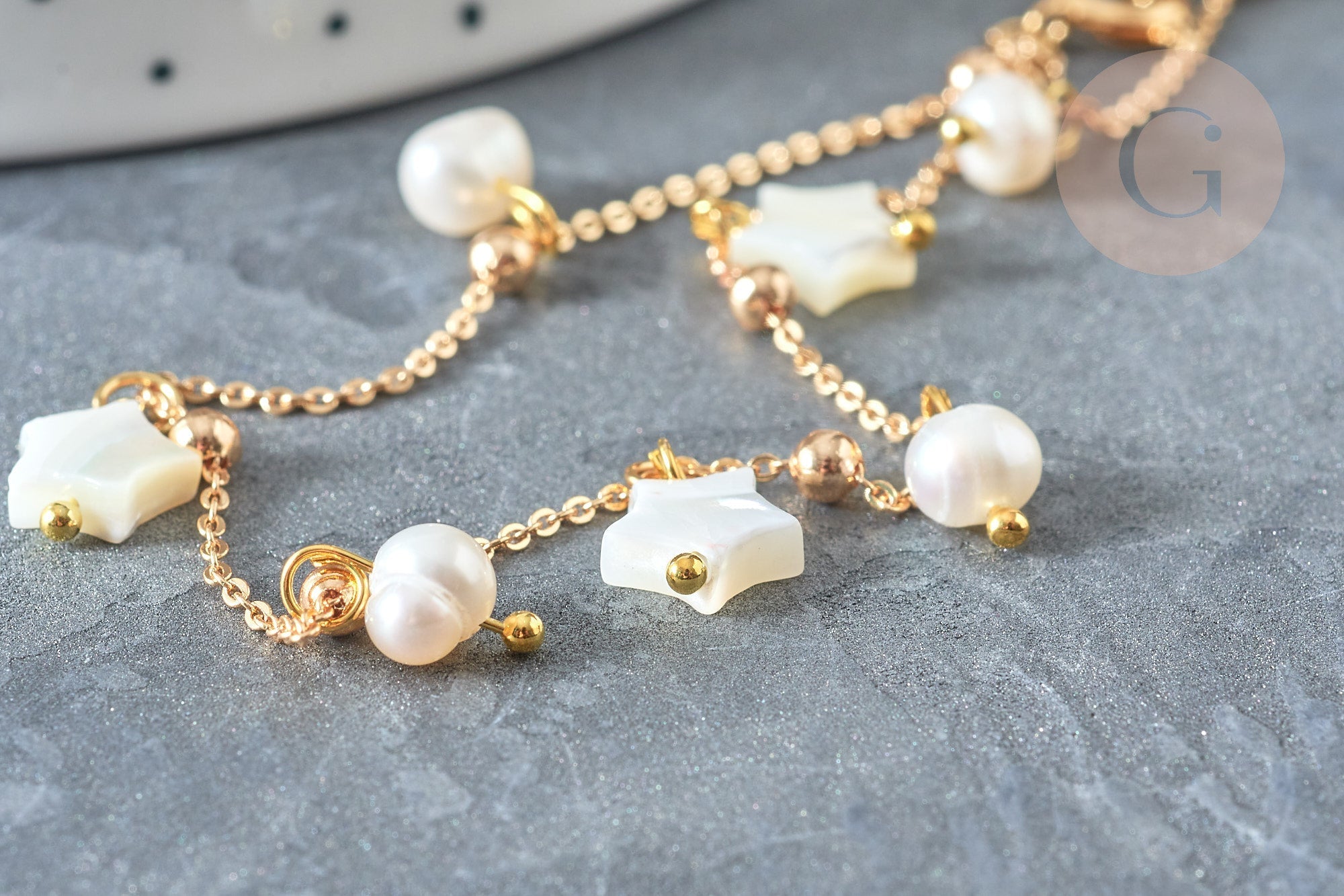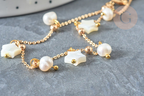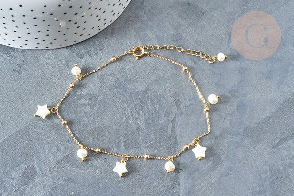 Ce bijou de cheville est accessoirisé d'étoiles en nacre blanche et de perles d'eau douce véritables, blanche également. Celui-ci est déjà muni d'un mousqueton pour une attache facile. Mettez-le à votre cheville et accordez le facilement avec toutes vos tenues.