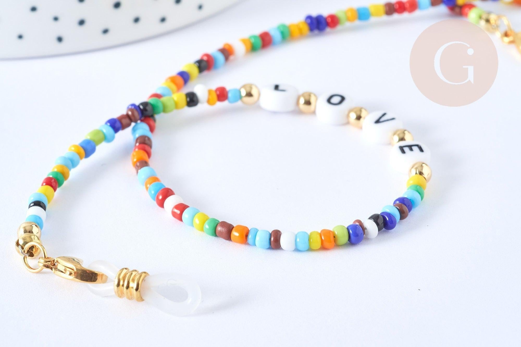 Adoptez ou offrez cette Chaîne de lunettes, colorée avec des perles "alphabet" en acrylique. Il est écrit "love" qui veut dire amour en anglais !