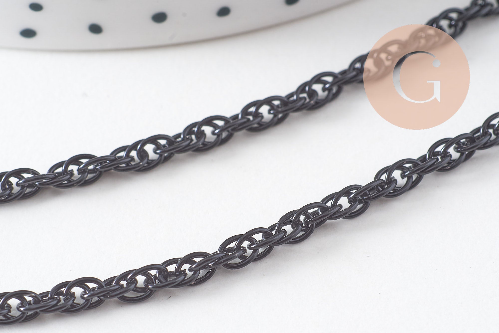Ajoutez une touche moderne et audacieuse à vos créations avec cette chaîne noire intense à maille plate, vendue en lot de 4 mètres. Fabriquée en métal avec une peinture vaporisée noire profonde, cette chaîne se distingue par son style contemporain et sa finition élégante.