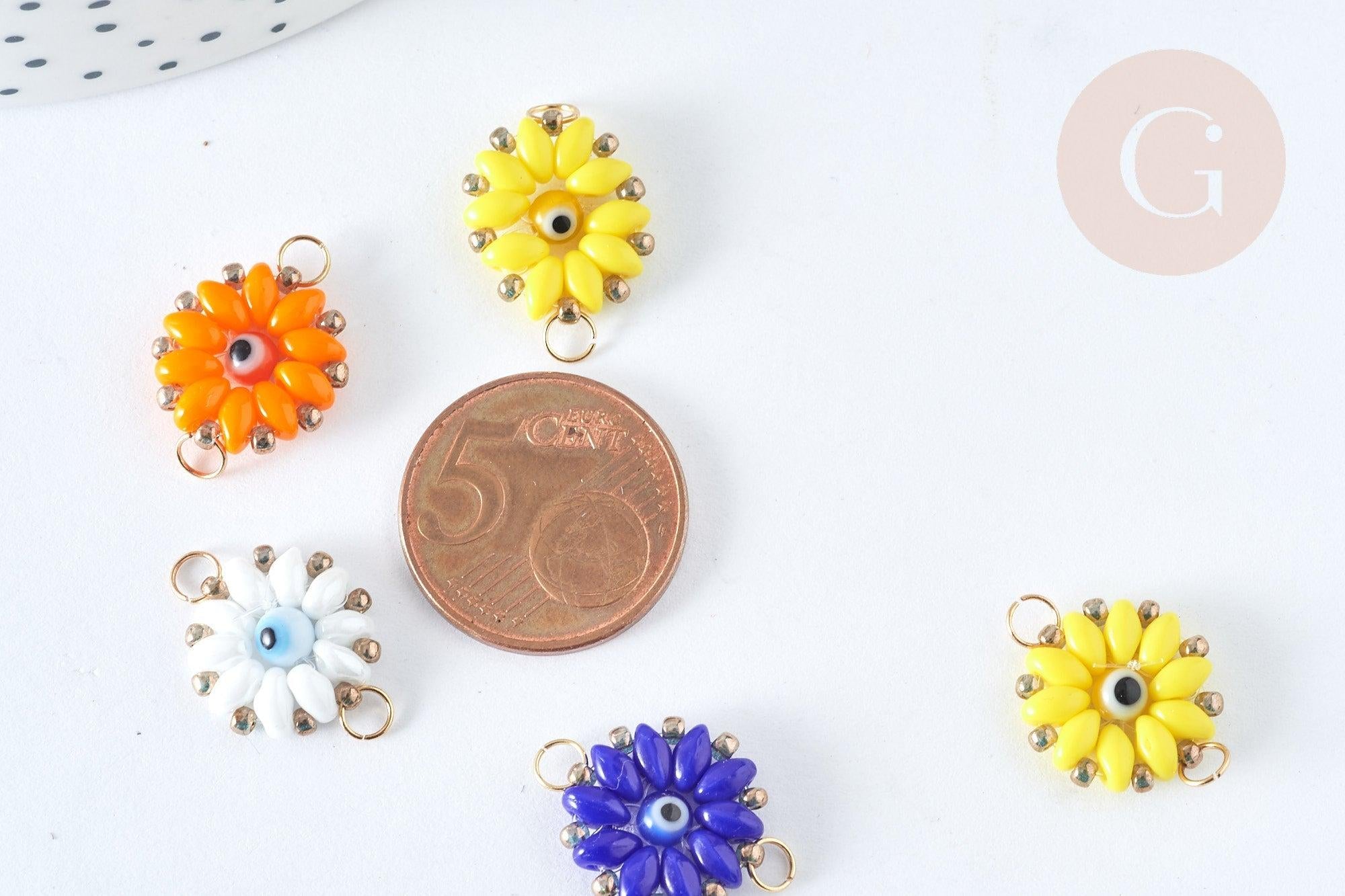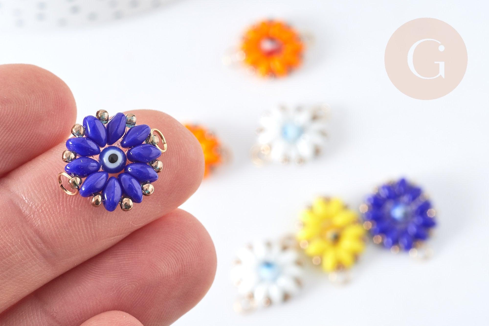 Craquez pour ce connecteur en verre, fait main. Celui-ci est en forme Fleur. De plus, ses attaches sont des anneaux en acier 304 inoxydable doré. Ceux-ci vont vous permettre de les accrocher où vous voulez !