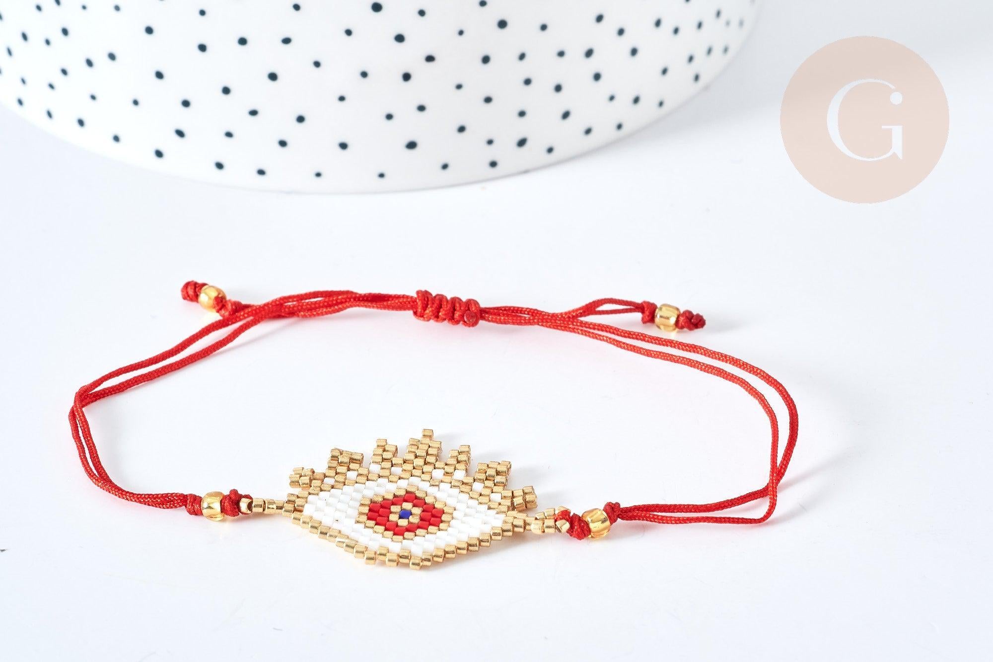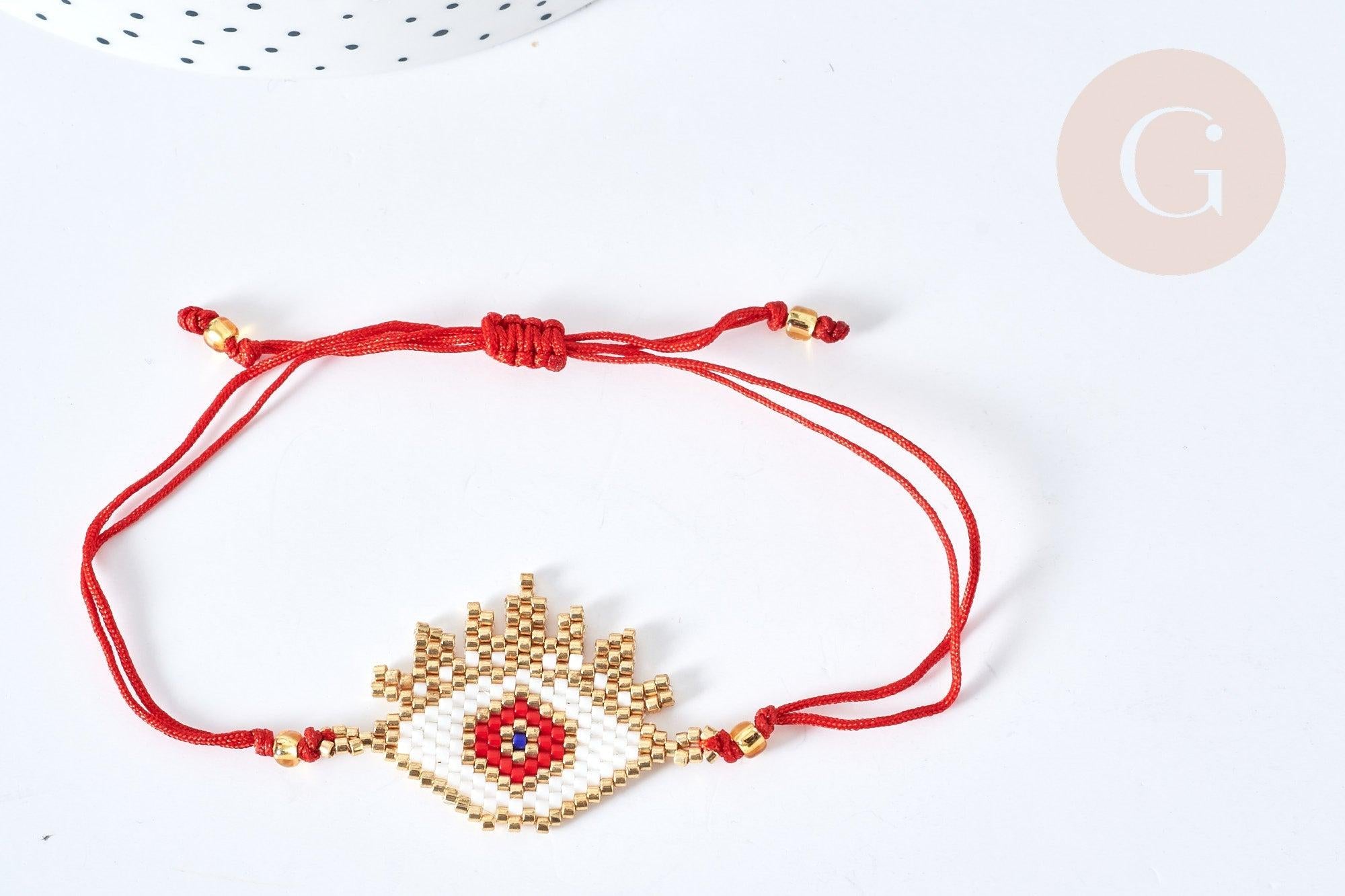 Les perles de rocaille rouges, blanches et dorées sont minutieusement tissées pour créer un motif d'œil protecteur, symbole de chance et de protection dans de nombreuses cultures. Le bracelet en nylon rouge est réglable pour s'adapter à toutes les tailles de poignet.