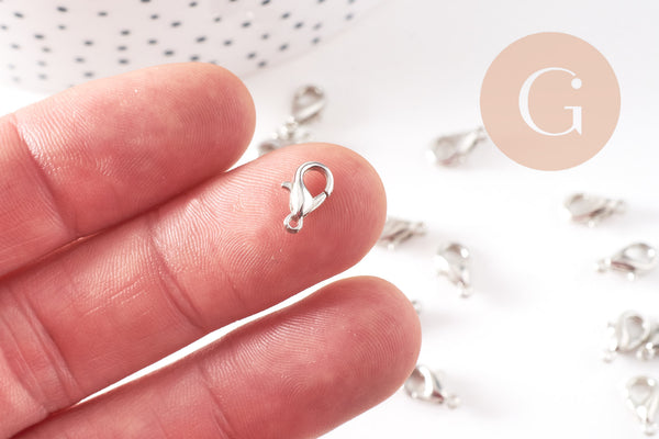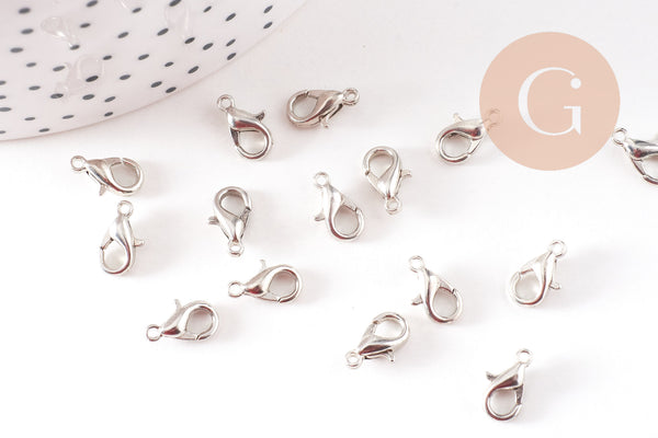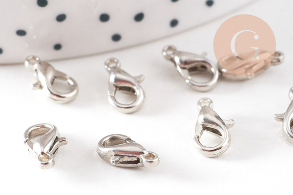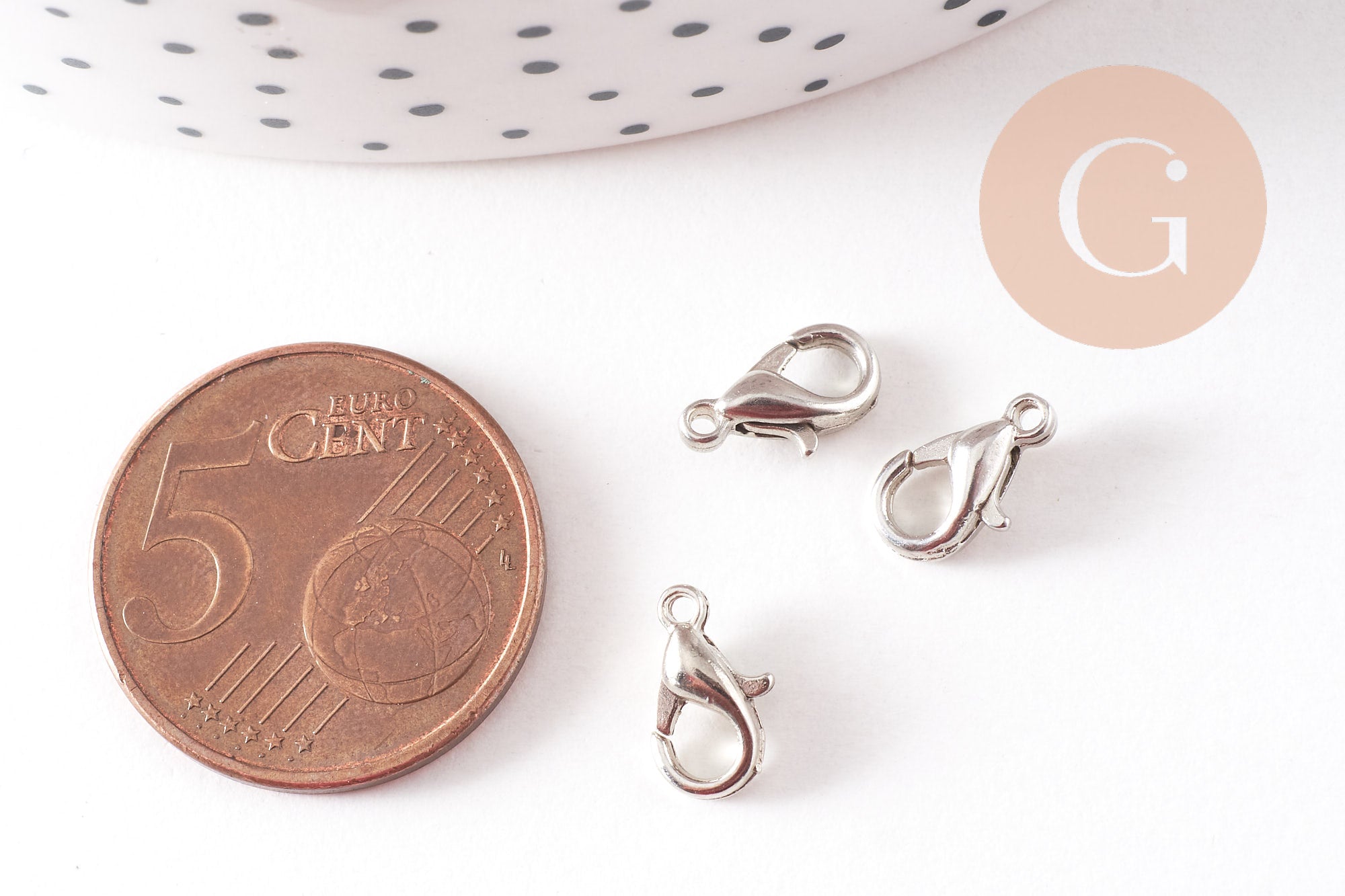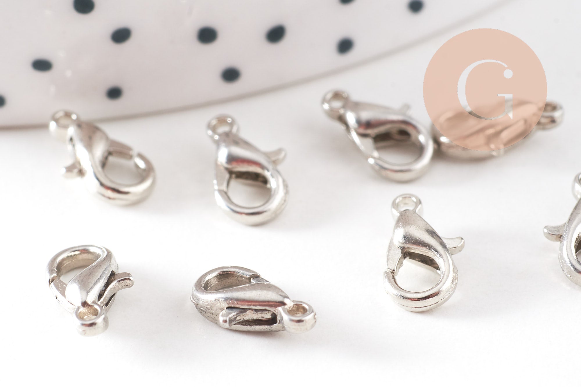 Indispensables pour toutes vos créations de bijoux, ces fermoirs mousquetons en zamac couleur platine (aspect argenté brillant) offrent une finition élégante et professionnelle à vos colliers, bracelets et sautoirs.