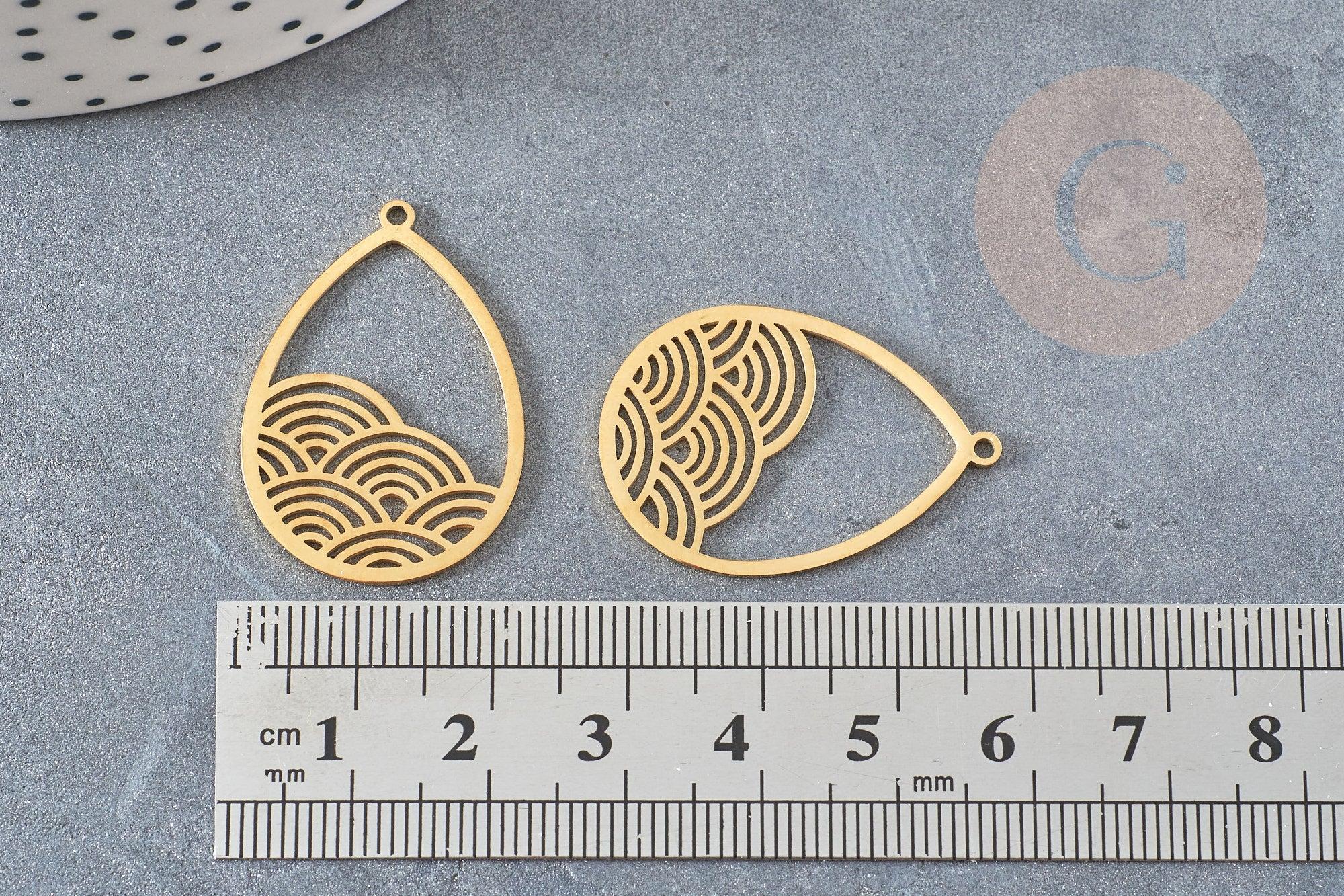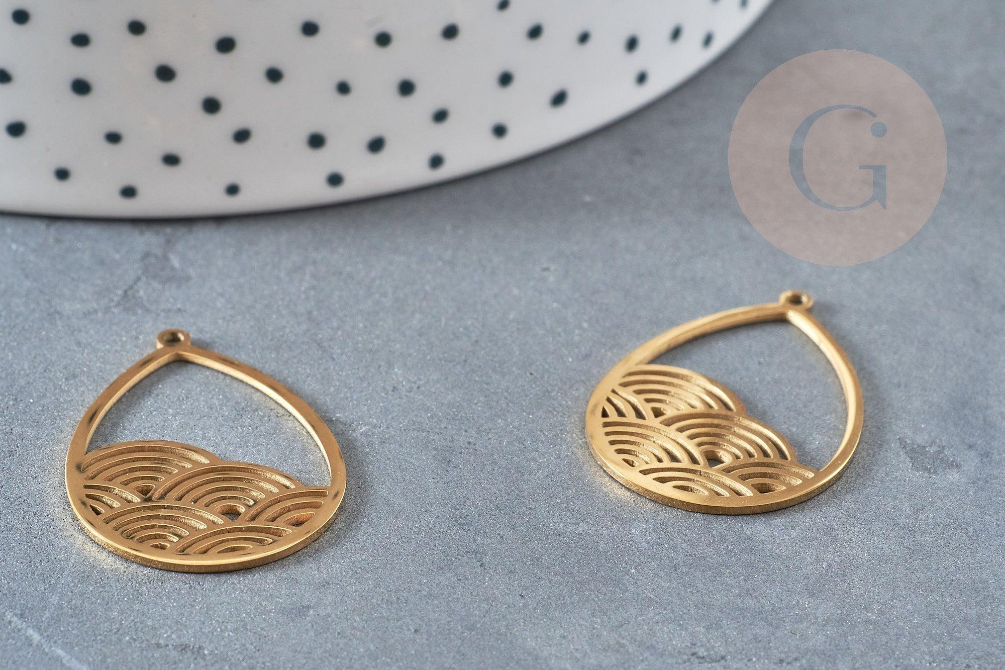 Un Pendentif acier doré en forme de goutte de pluie, décoré de vagues en acier inoxydable doré