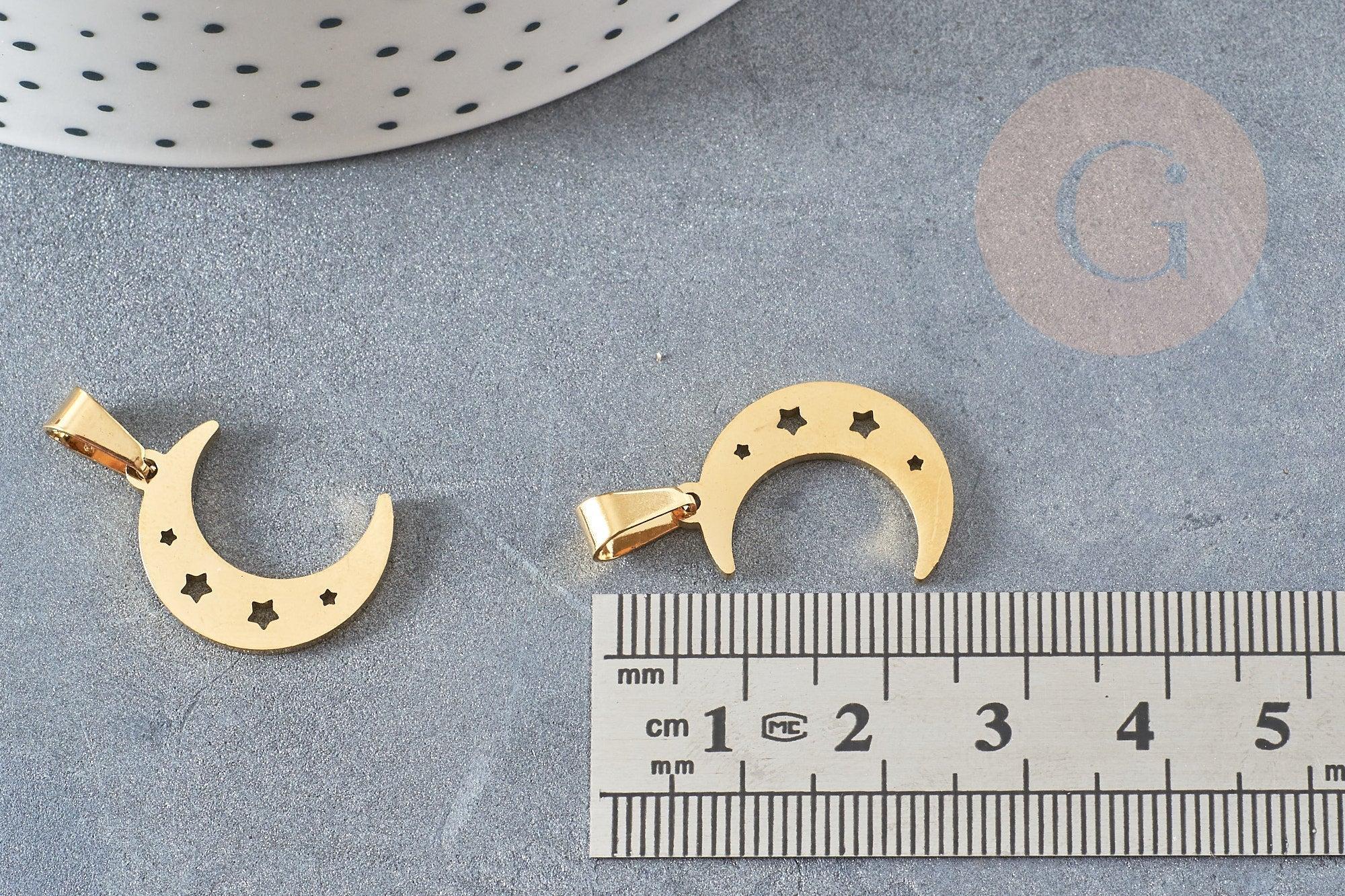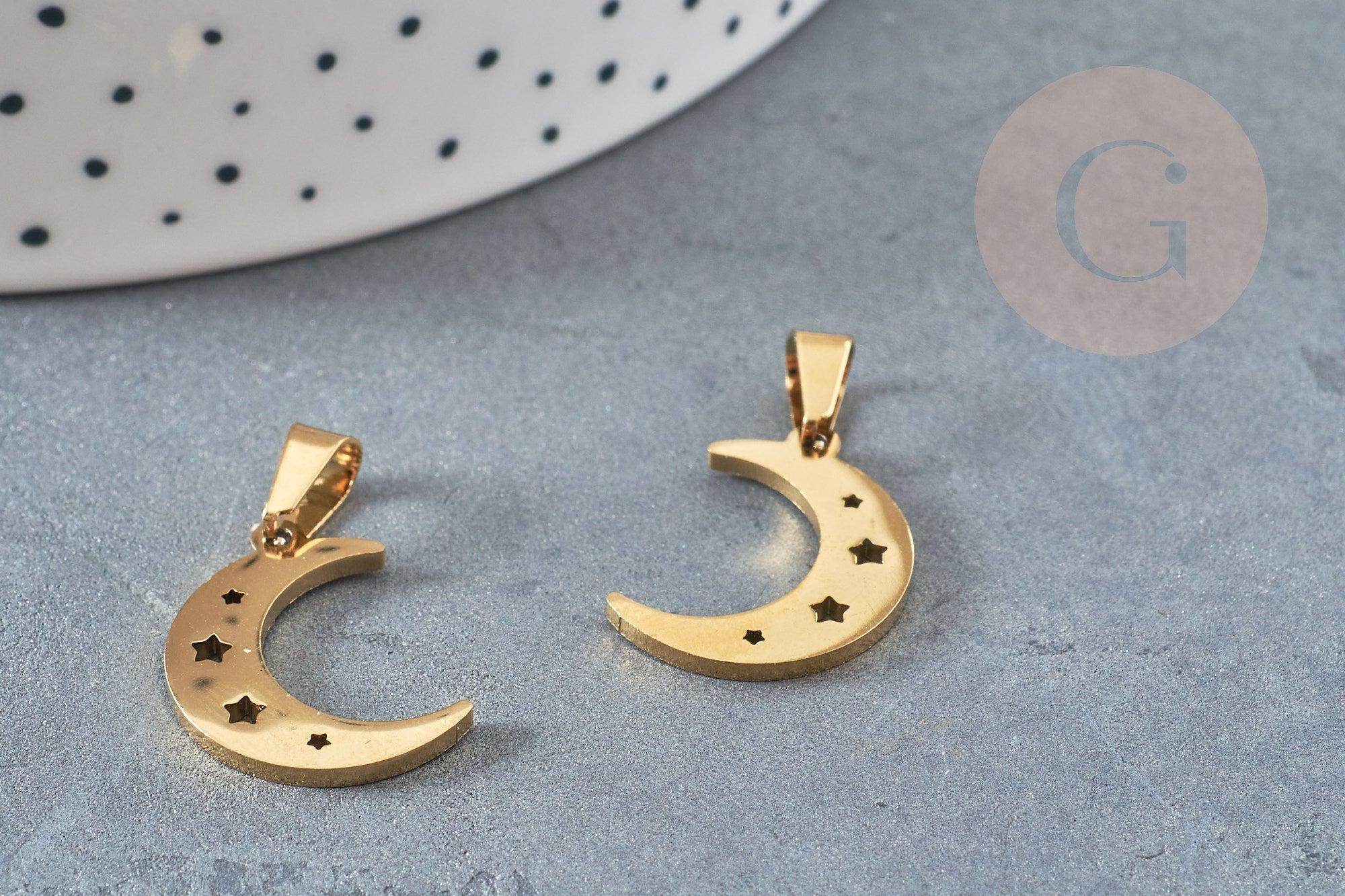Pour vos bijoux dans la tendance stellaires, voici un adorable pendentif en forme de lune évidé de motifs d'étoiles en acier doré, que vous pourrez agrémenter d'une pierre, de perles.