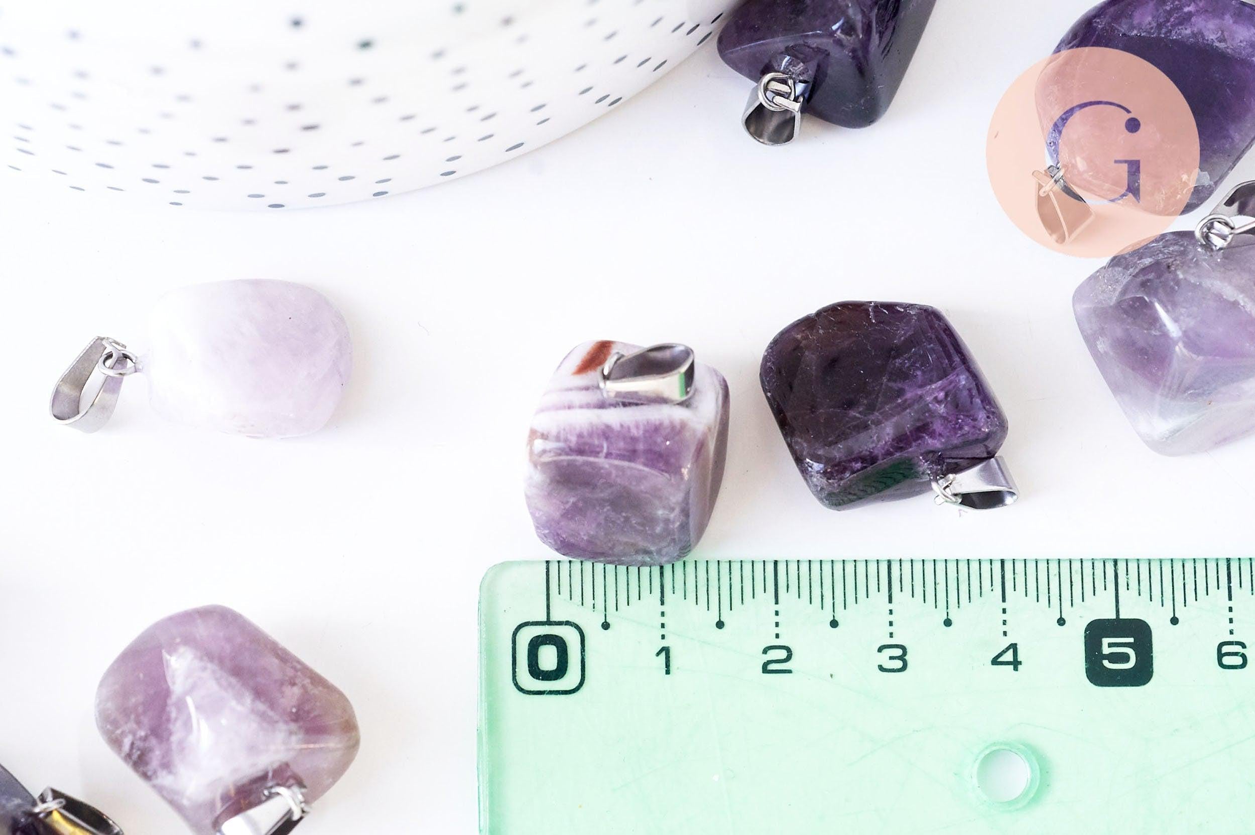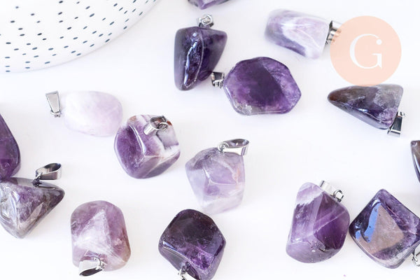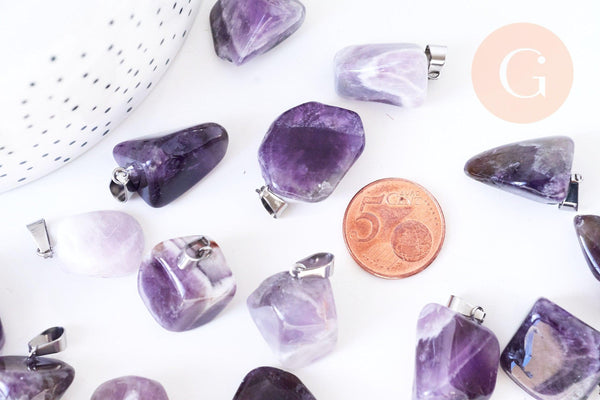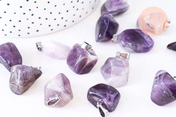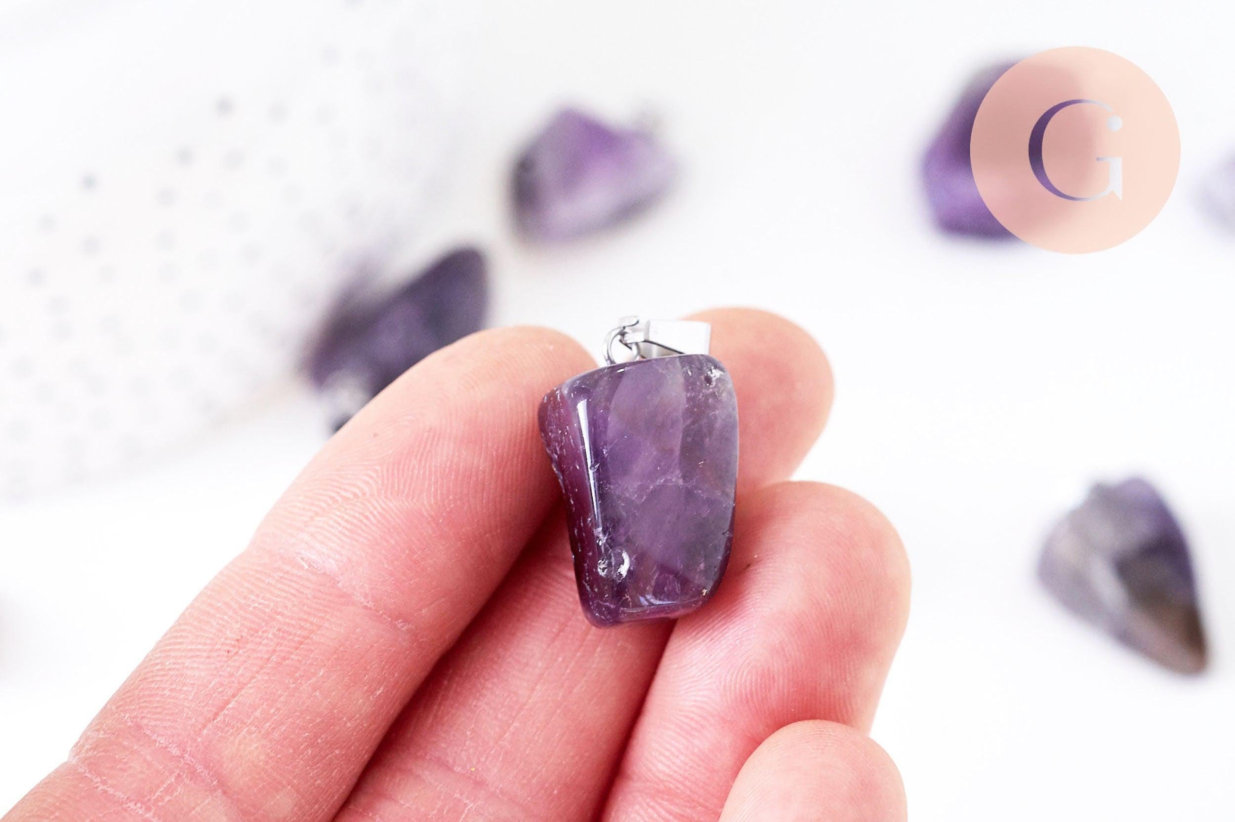 Apportez une touche mystique, naturelle et intemporelle à vos créations avec ce pendentif en améthyste naturelle roulée, monté sur un support en acier inoxydable finition platine. Chaque pierre est unique par sa forme, sa couleur et ses nuances violettes, ce qui en fait un bijou véritablement authentique et chargé de sens. L’améthyste est souvent associée à l’apaisement, l’intuition et la sérénité : un pendentif parfait pour un collier talisman ou un bijou grigri à porter au quotidien.