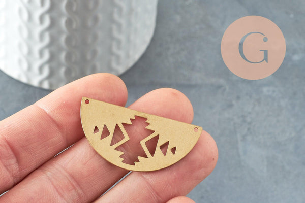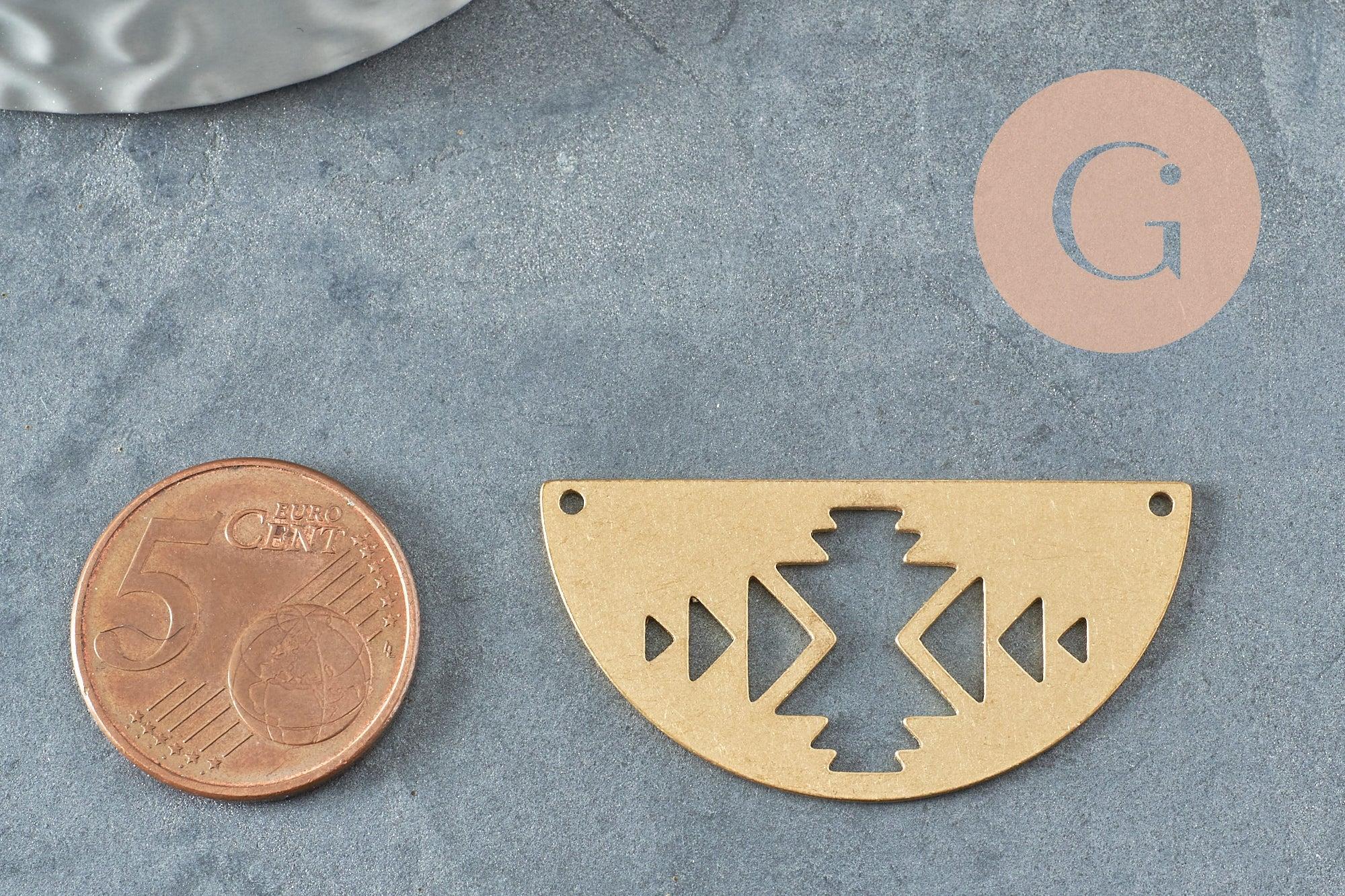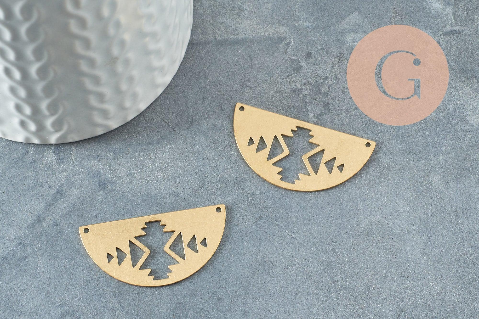 Un pendentif original en forme de demi cercle évidé de motifs aztèques en laiton brut, idéal pour réaliser vos boucles, sautoir et colliers dans la tendance géométrique.