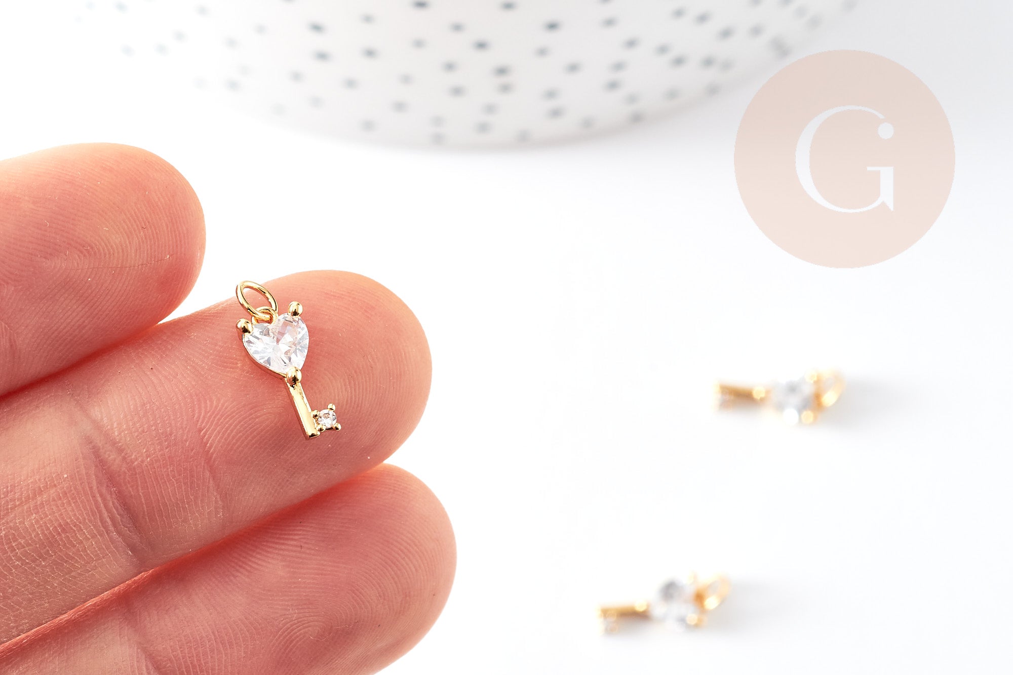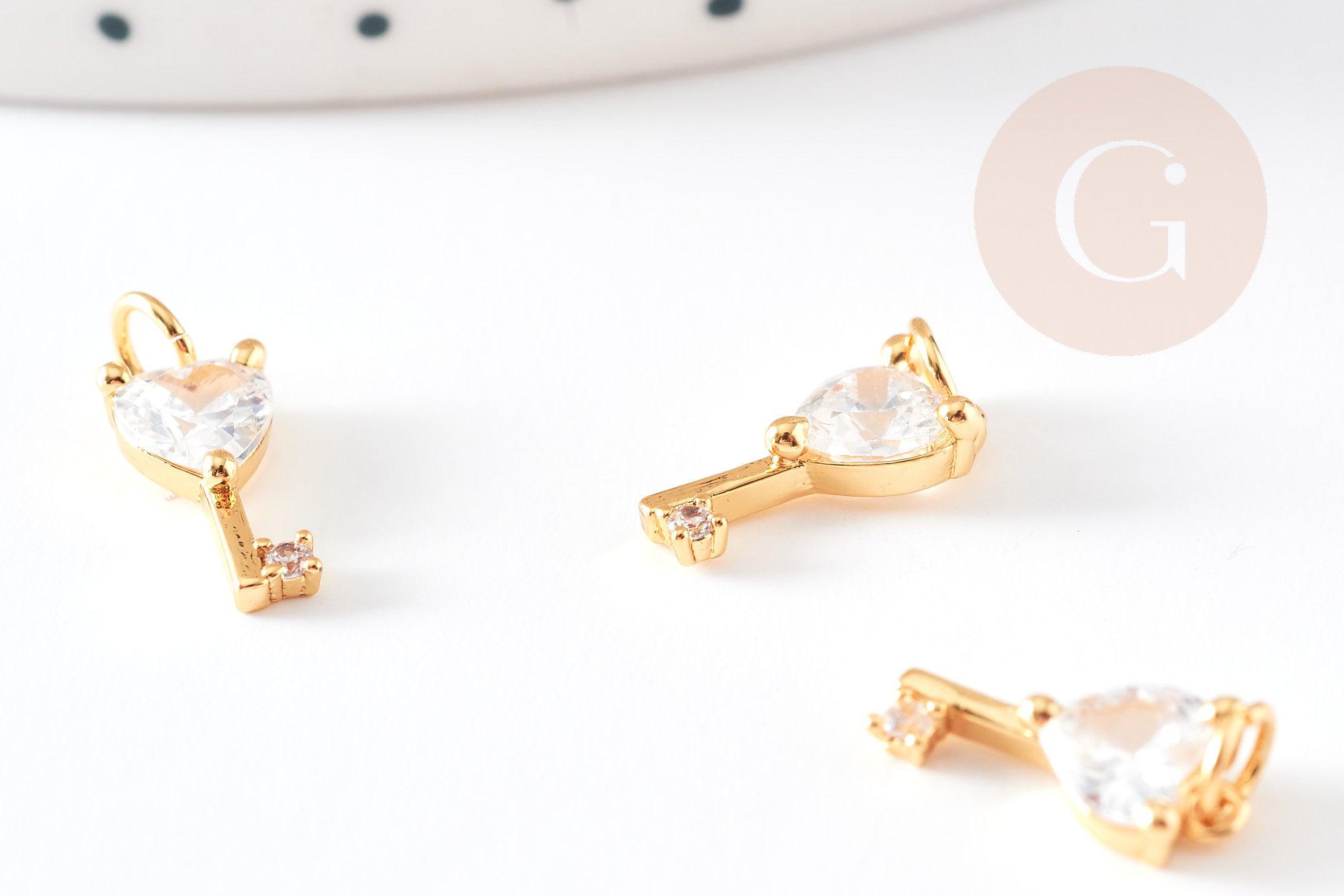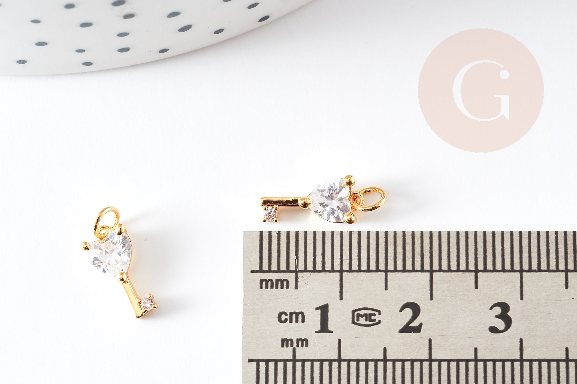 EP-Pendentif breloque clef laiton doré et zircon 10mm, x1 (G3834)