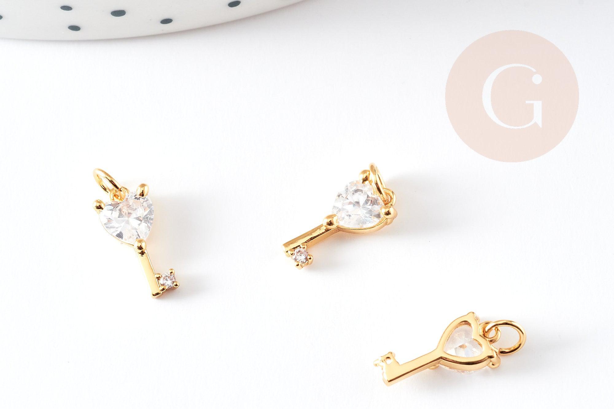 pendentif breloque clef coeur laiton doré et zircon, création de bijou doré en cristal, 10mm, l'unité Adoptez de suite ces petits pendentifs cœur en laiton doré pour créer vos petits bijoux d'amour : idéaux pour créer boucles, bracelets et colliers...