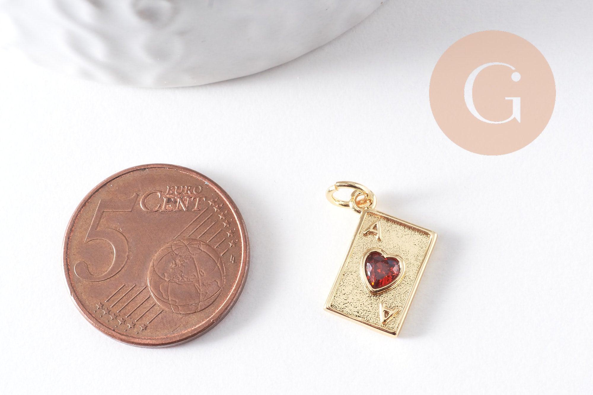 Ajoutez une touche ludique et élégante à vos créations avec ce pendentif en forme de carte à jouer cœur, orné d’un zircon rouge éclatant. Fabriqué en laiton doré 18K, ce charm de 15mm est parfait pour la création de colliers, bracelets ou boucles d’oreilles.