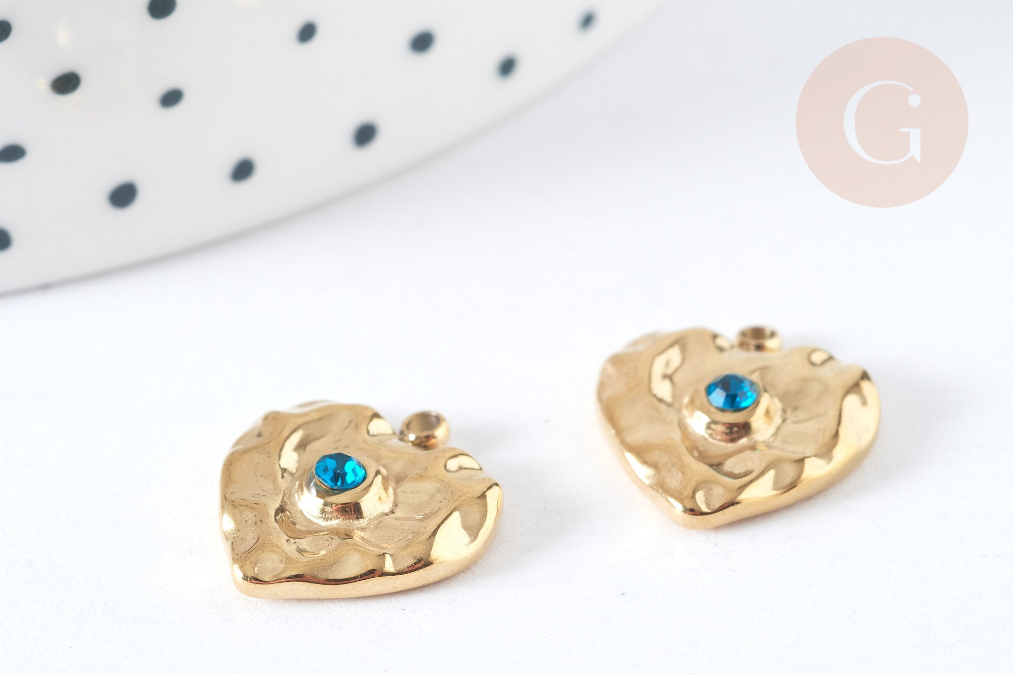 Un pendentif cœur, martelé et composé d' acier inoxydable 304 doré. Au centre se trouve un zircon bleu facettée et qui brille !