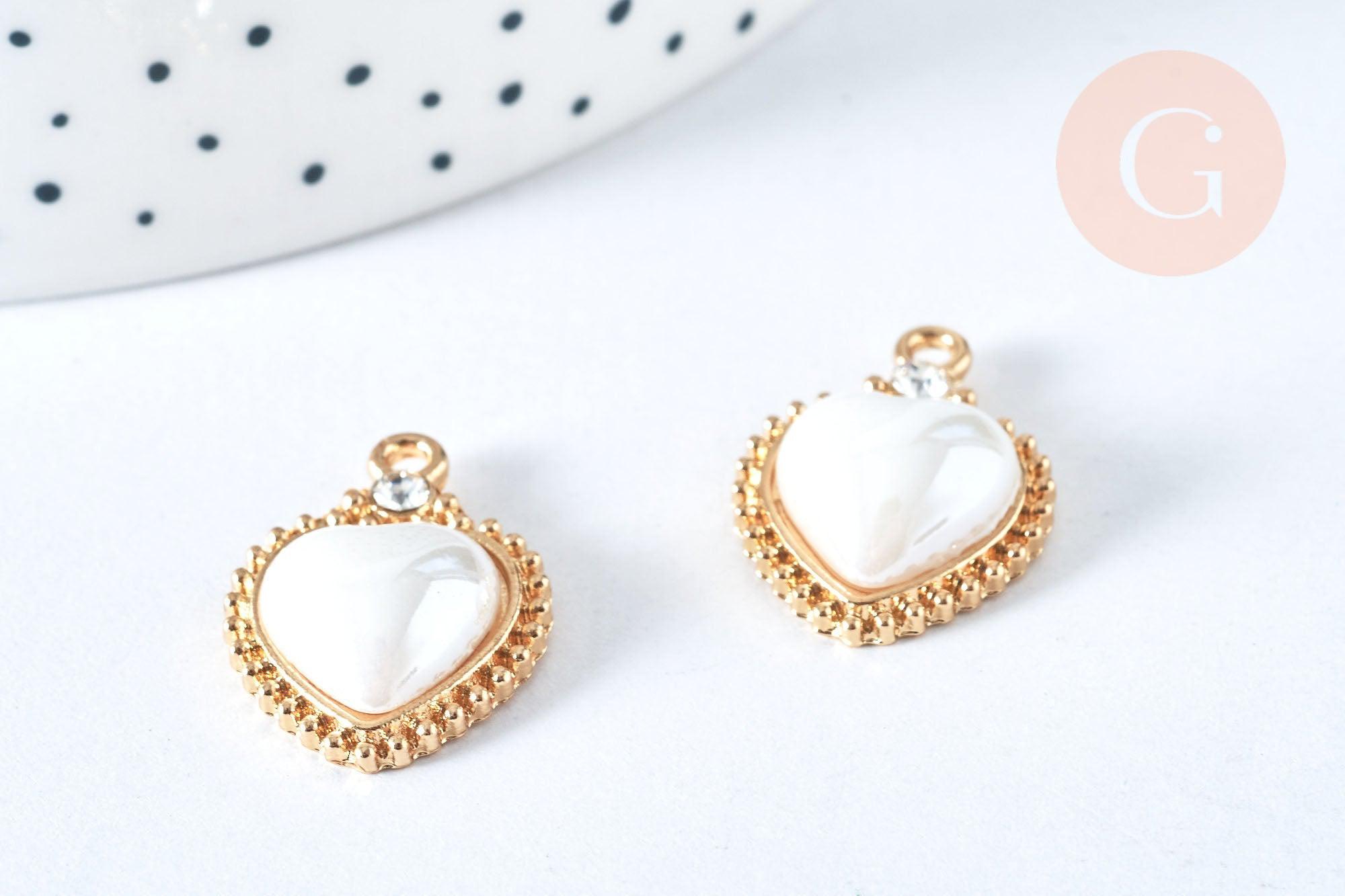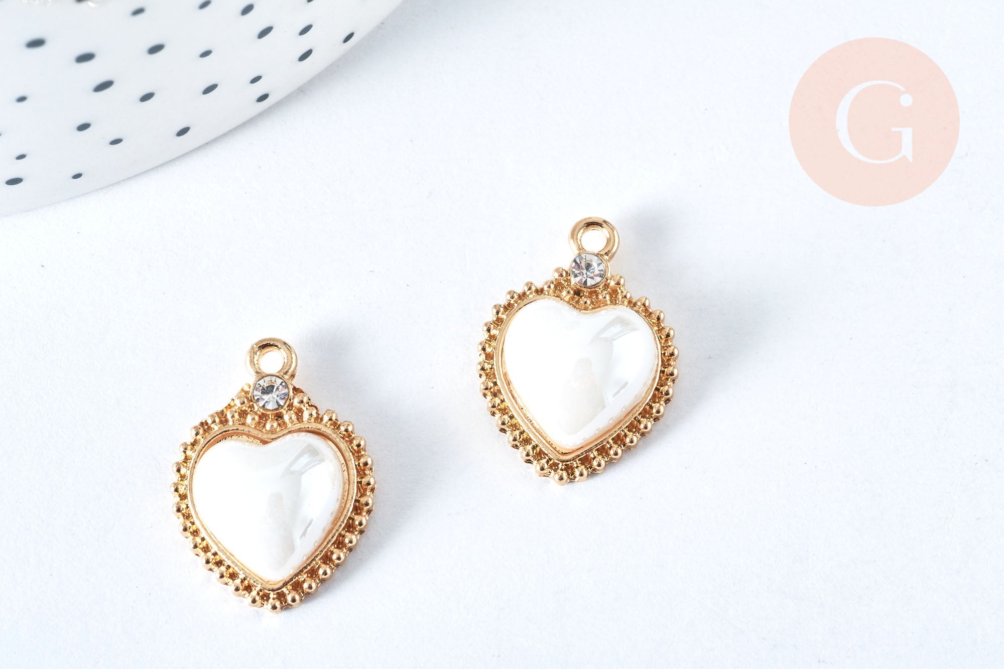 Pendentif cœur porcelaine strass blanc laiton doré 18K 23mm, perle porcelaine cœur pour fabrication bijoux, x1 G6973