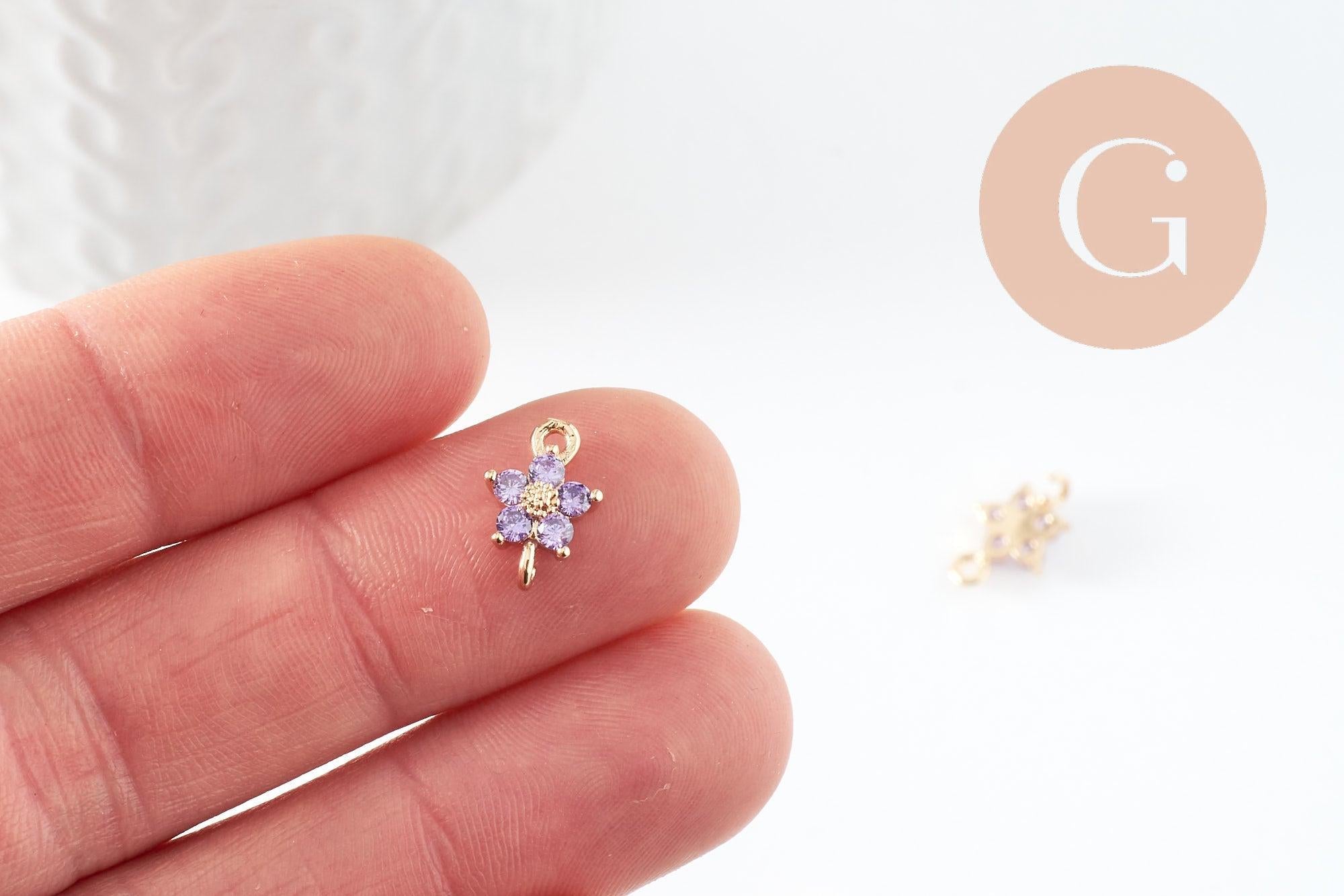 Pendentif connecteur fleur doré 24 carats zircon violet,pendentif doré cristal, création bijoux,12.5mm, l'unité