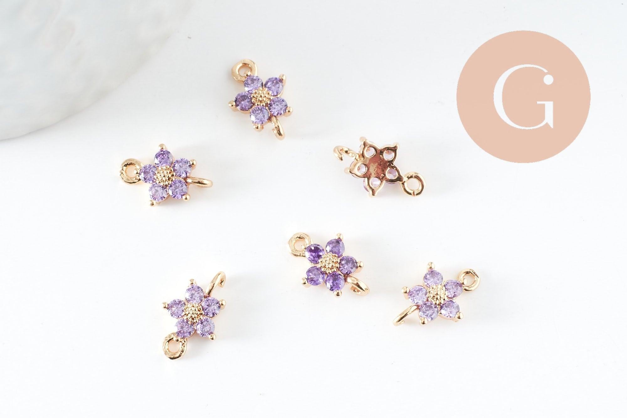 Pendentif connecteur fleur doré 24 carats zircon violet,pendentif doré cristal, 12.5mm, x1 (G4035)
