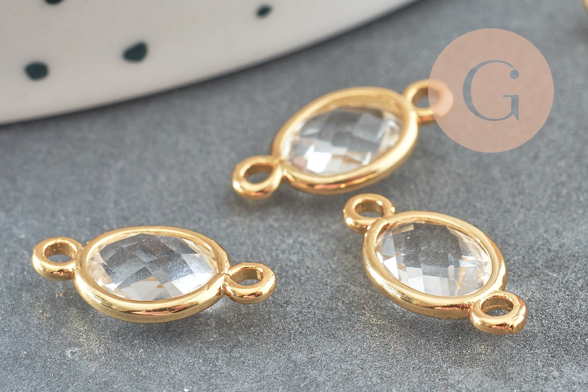 Craquez pour ce duo de pendentifs connecteurs ovales en cristal transparent montés sur un support en laiton doré. Leur design élégant et épuré sublimera vos créations de bijoux avec une touche précieuse et lumineuse.