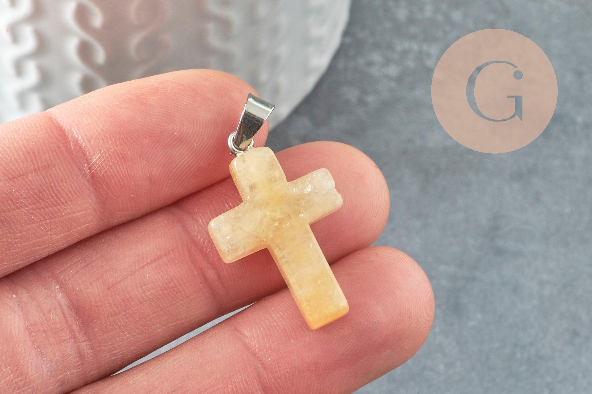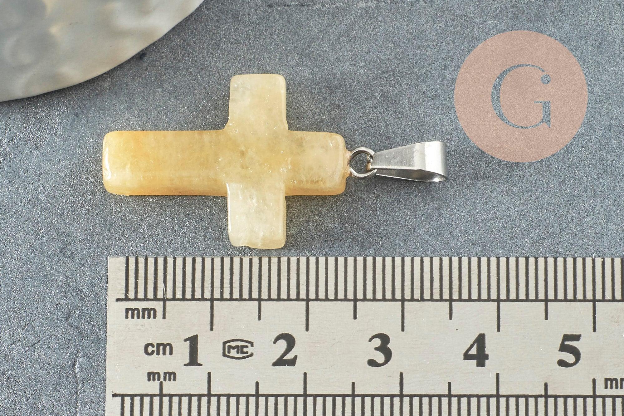 Pendentif croix jade naturel jaune topaze acier inoxydable 29mm,pendentif pierre, support argent, création bijouxjade naturel, x1 G5699