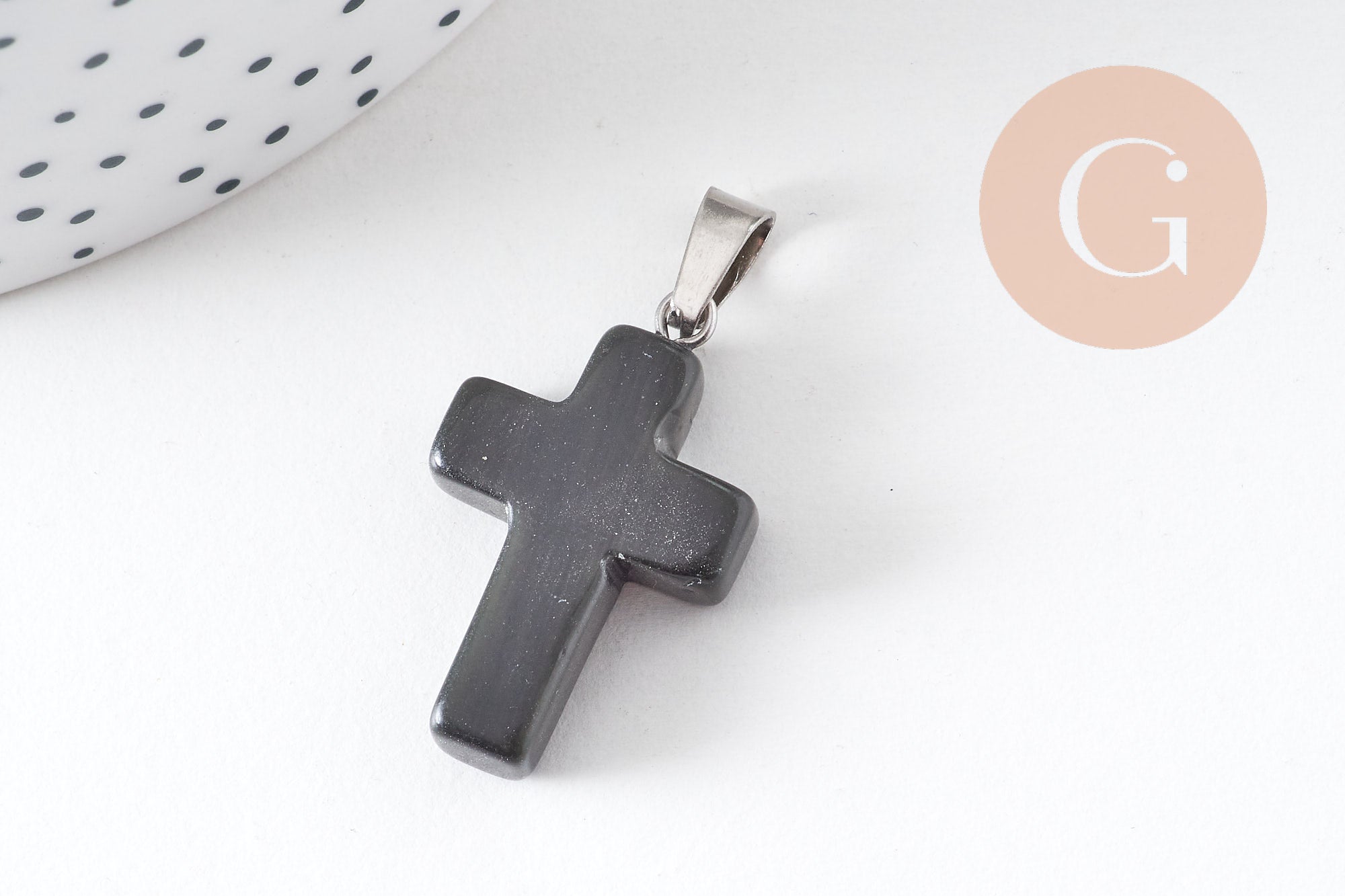 Pendentif croix jade naturel noir acier inoxydable 29mm,pendentif pierre, support argent, création bijoux,jade naturel,l x1 (G5704)