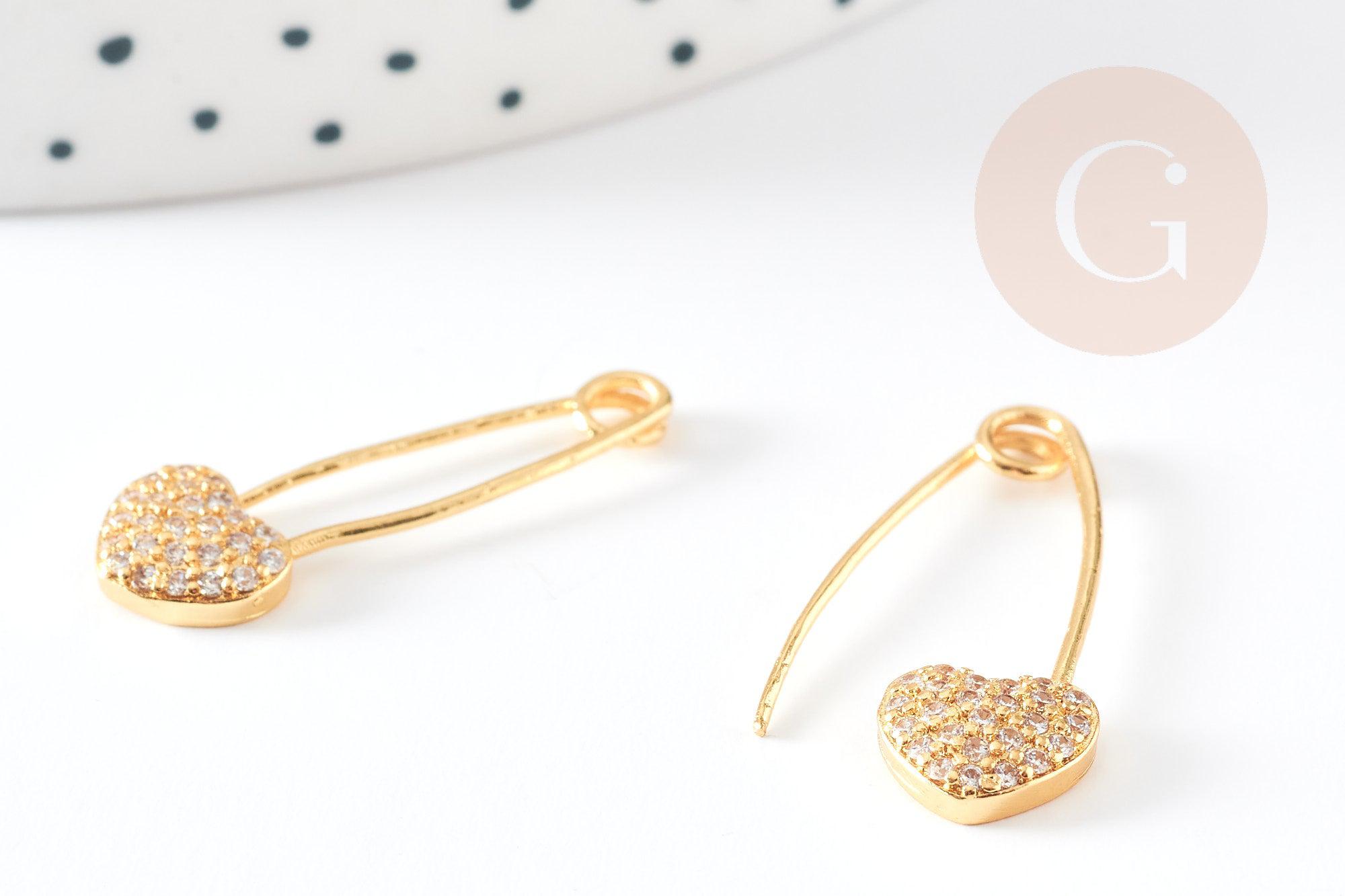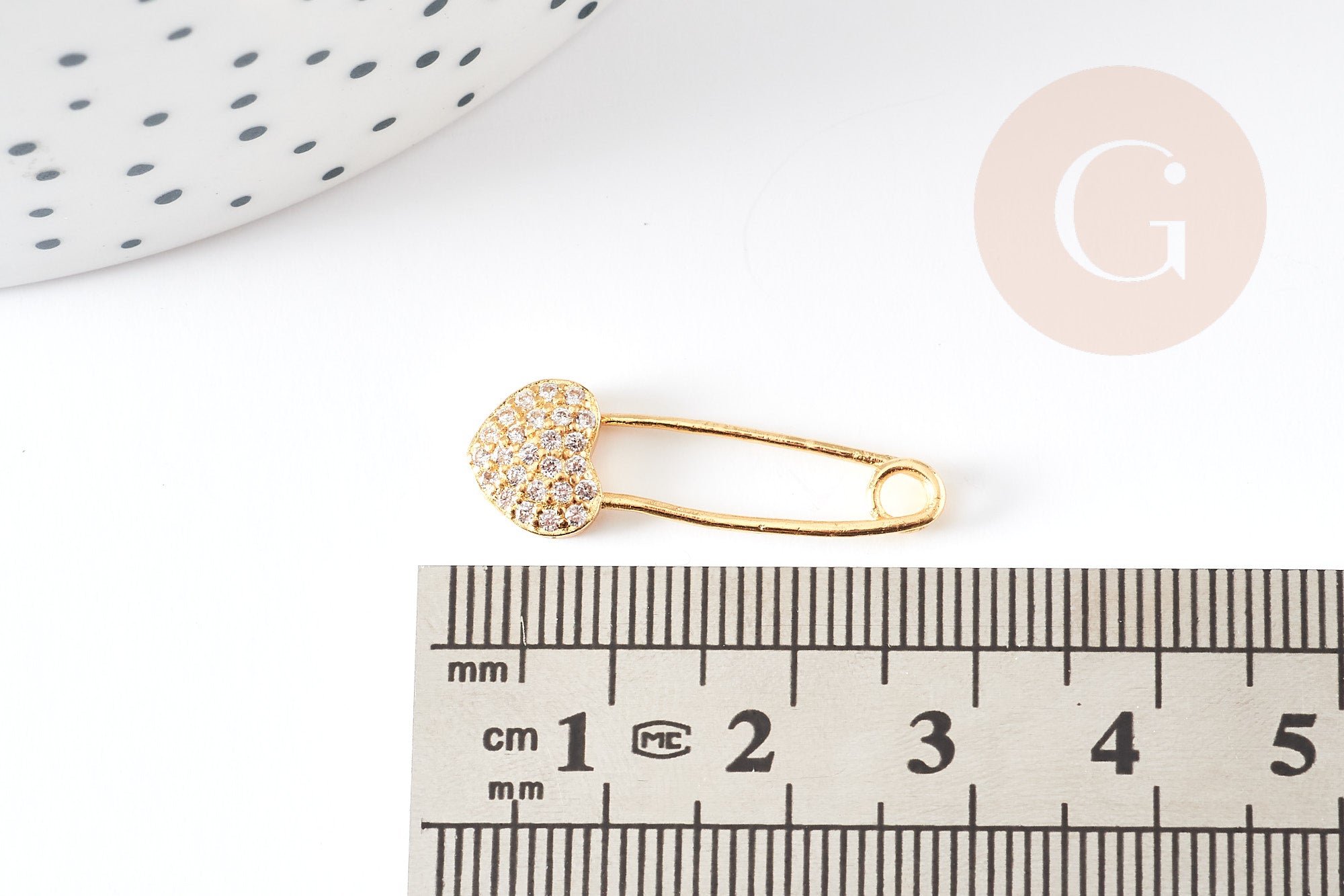 EP-Pendentif Epingle à nourrice coeur laiton doré 18k cristal 26.5mm,x1 (G3094)