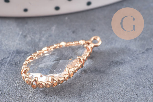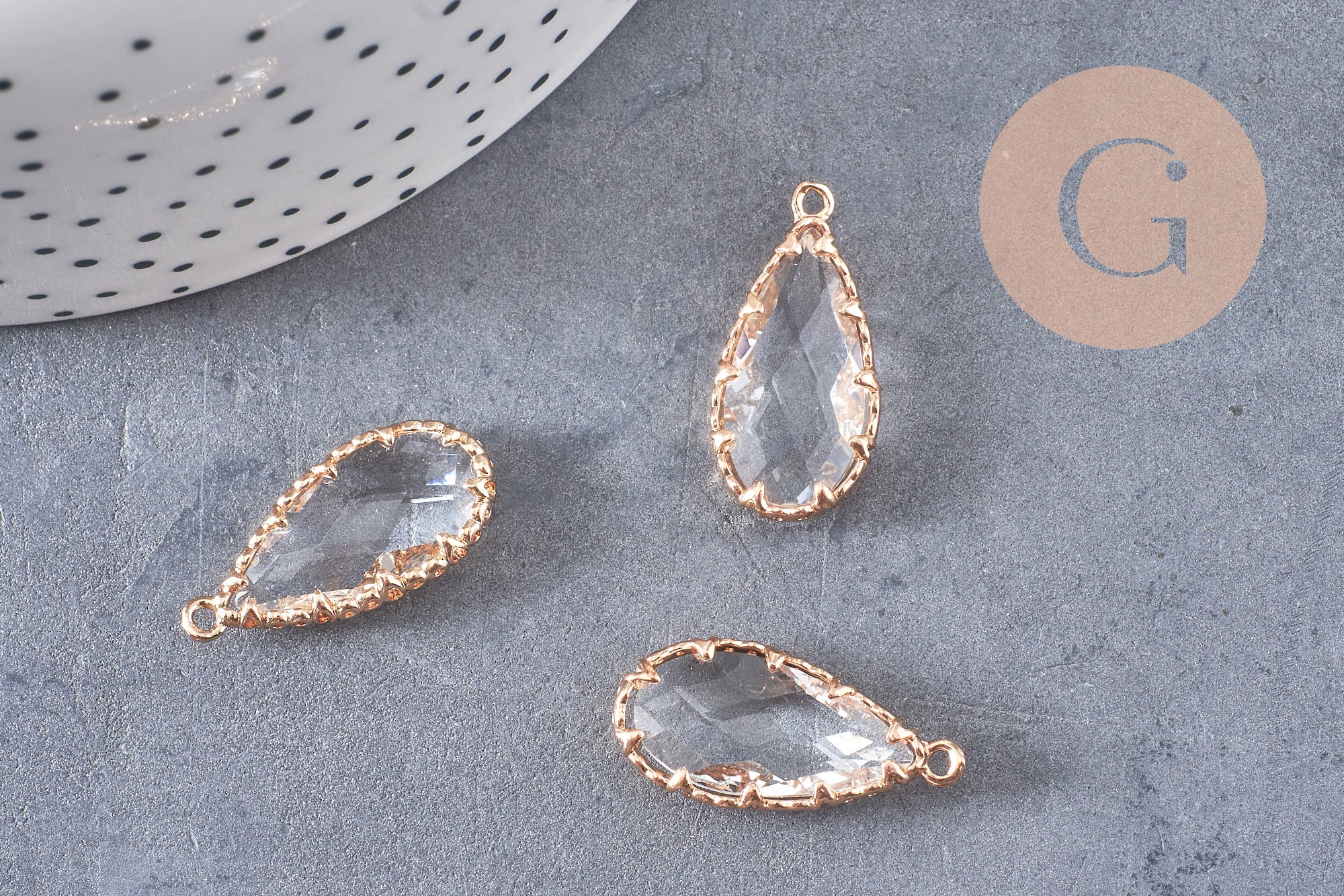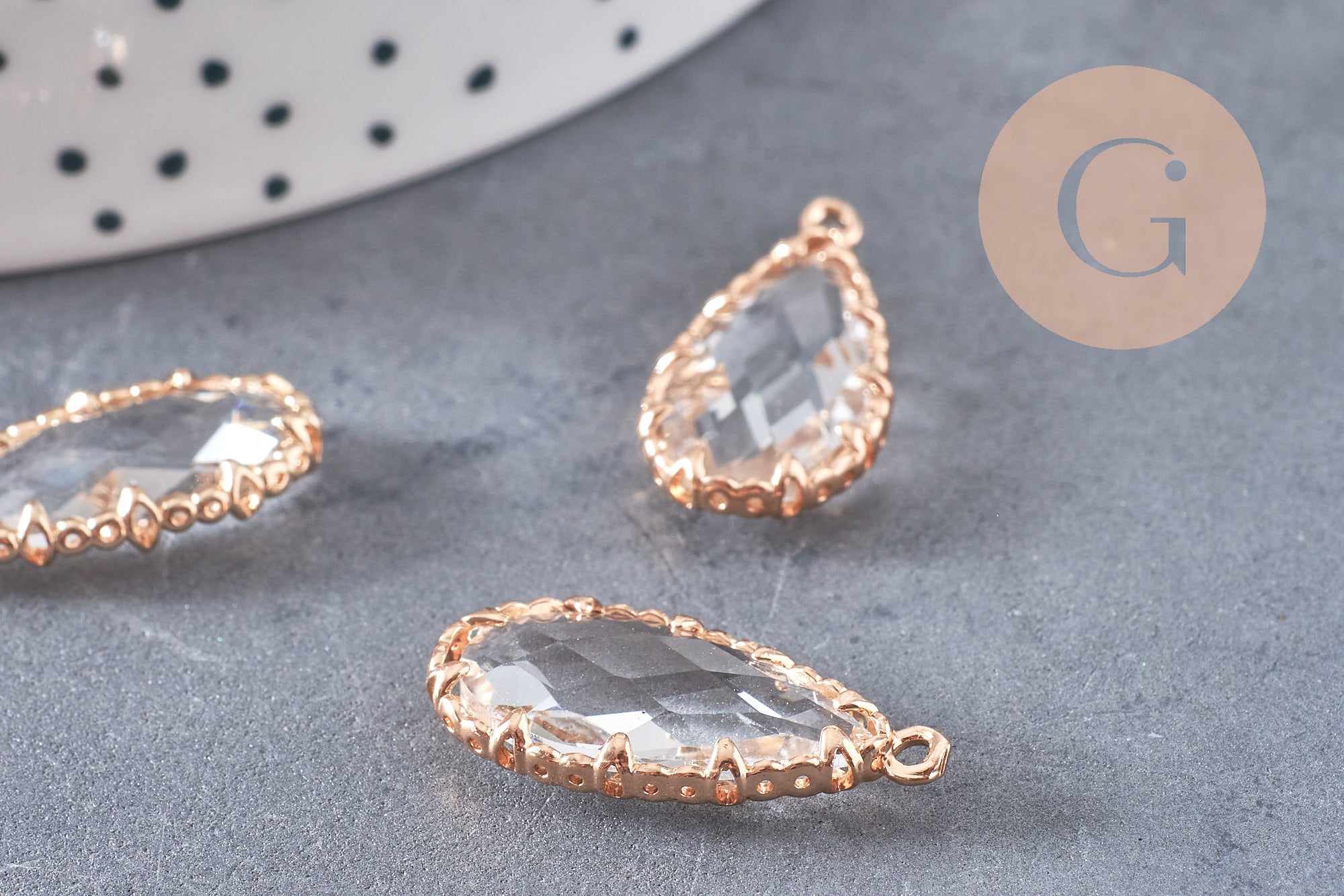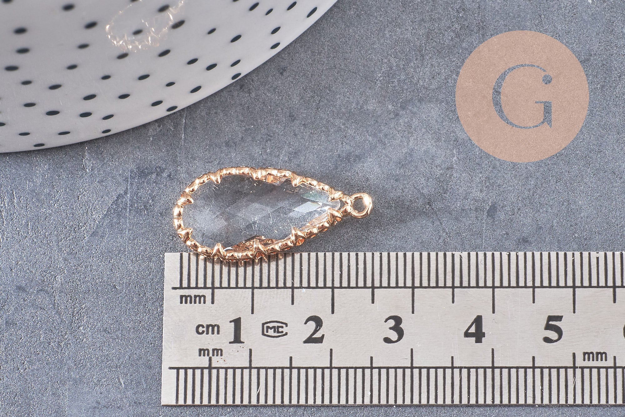 Apportez une touche d’élégance intemporelle à vos créations avec ce pendentif goutte en cristal transparent facetté, cerclé de laiton doré.