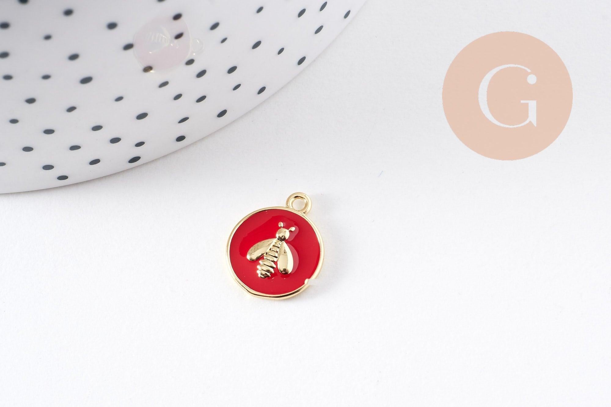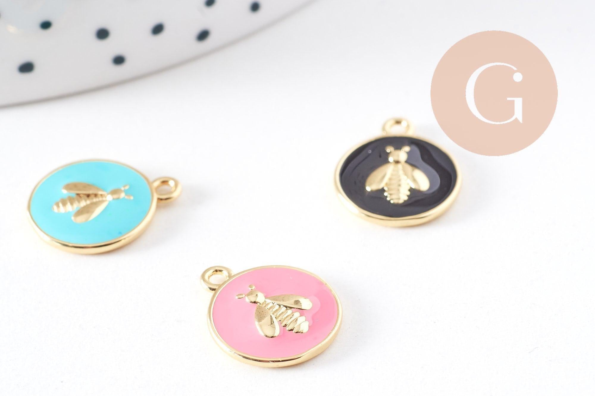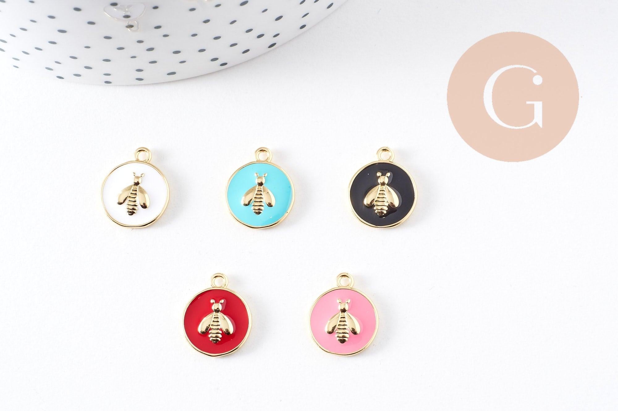 Sublime pendentif médaille ronde en laiton doré, orné d'une délicate abeille émaillée disponible en cinq couleurs vibrantes : rose, turquoise, blanc, noir et rouge.