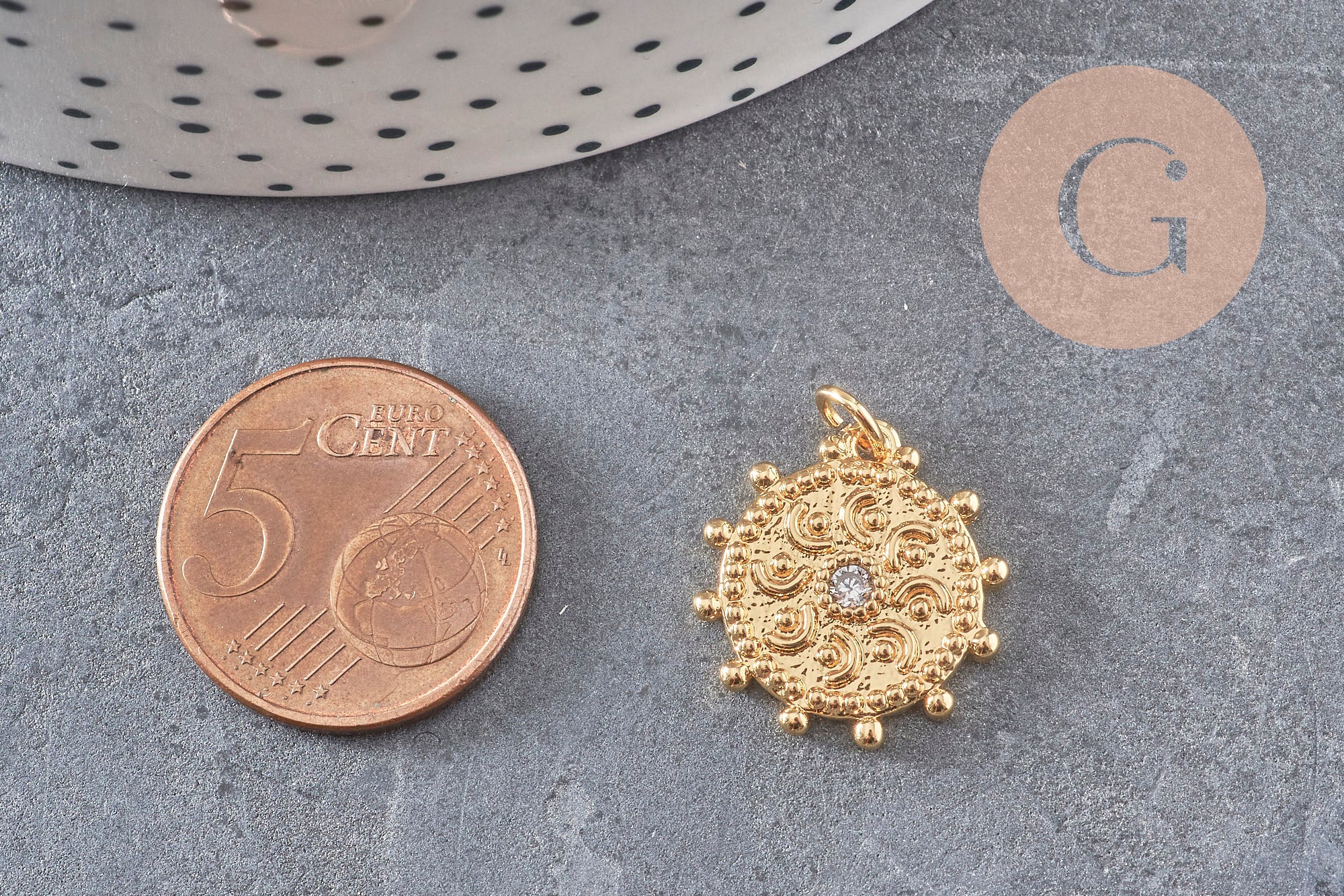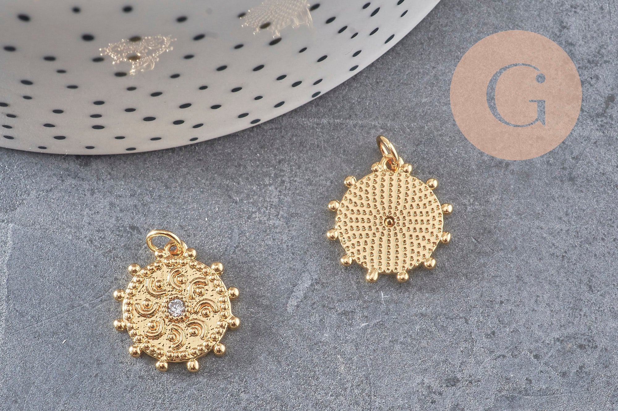 Pendentif médaille ronde soleil laiton doré zircon blanc, un pendentif doré avec cristal pour création bijoux,18mm, x1 (G4467)