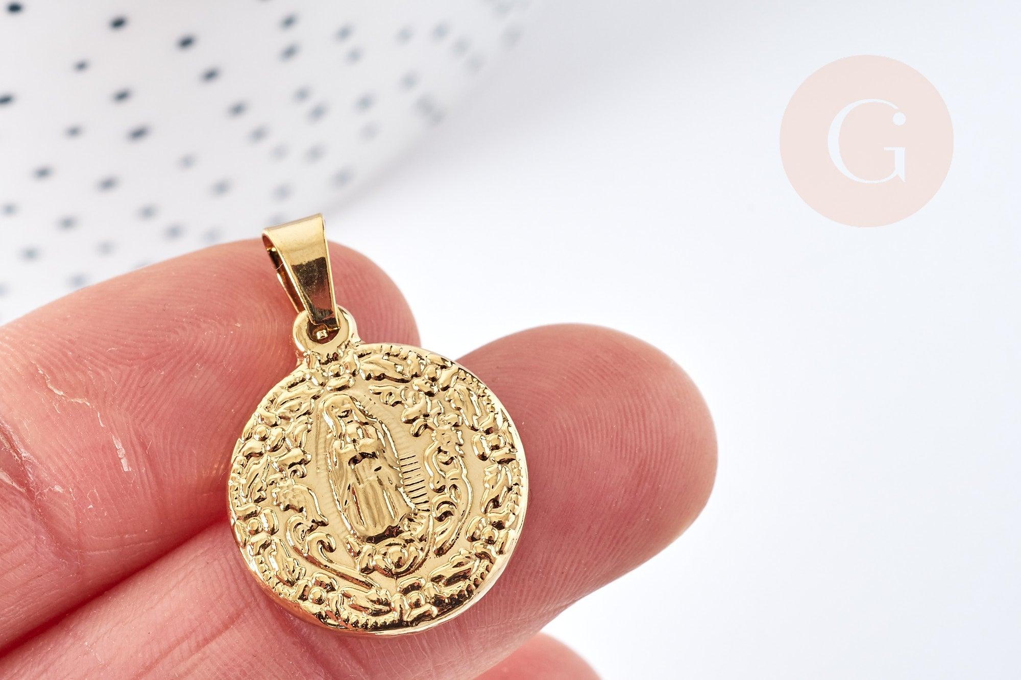 Pendentif médaille ronde vierge acier doré, pendentif doré sans nickel,médaille religion,acier doré, création bijoux,médaille or,22mm,