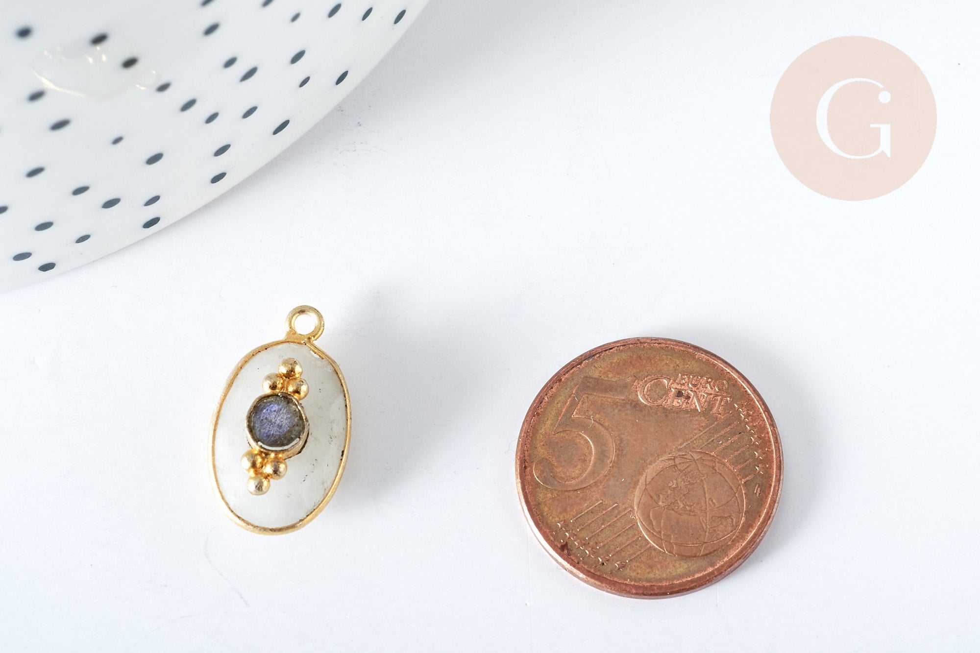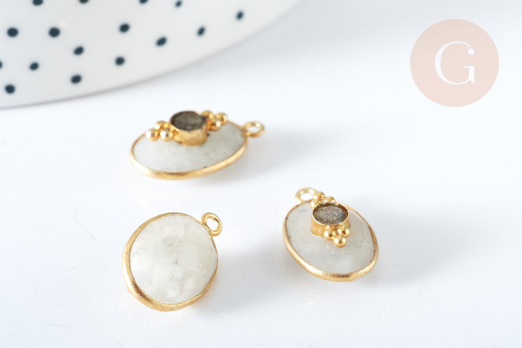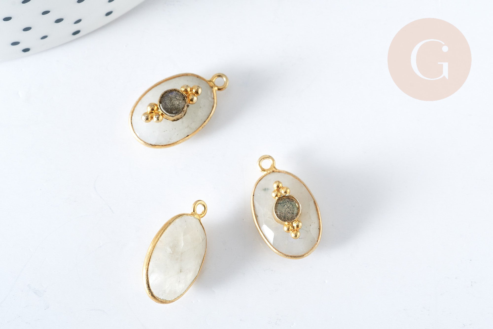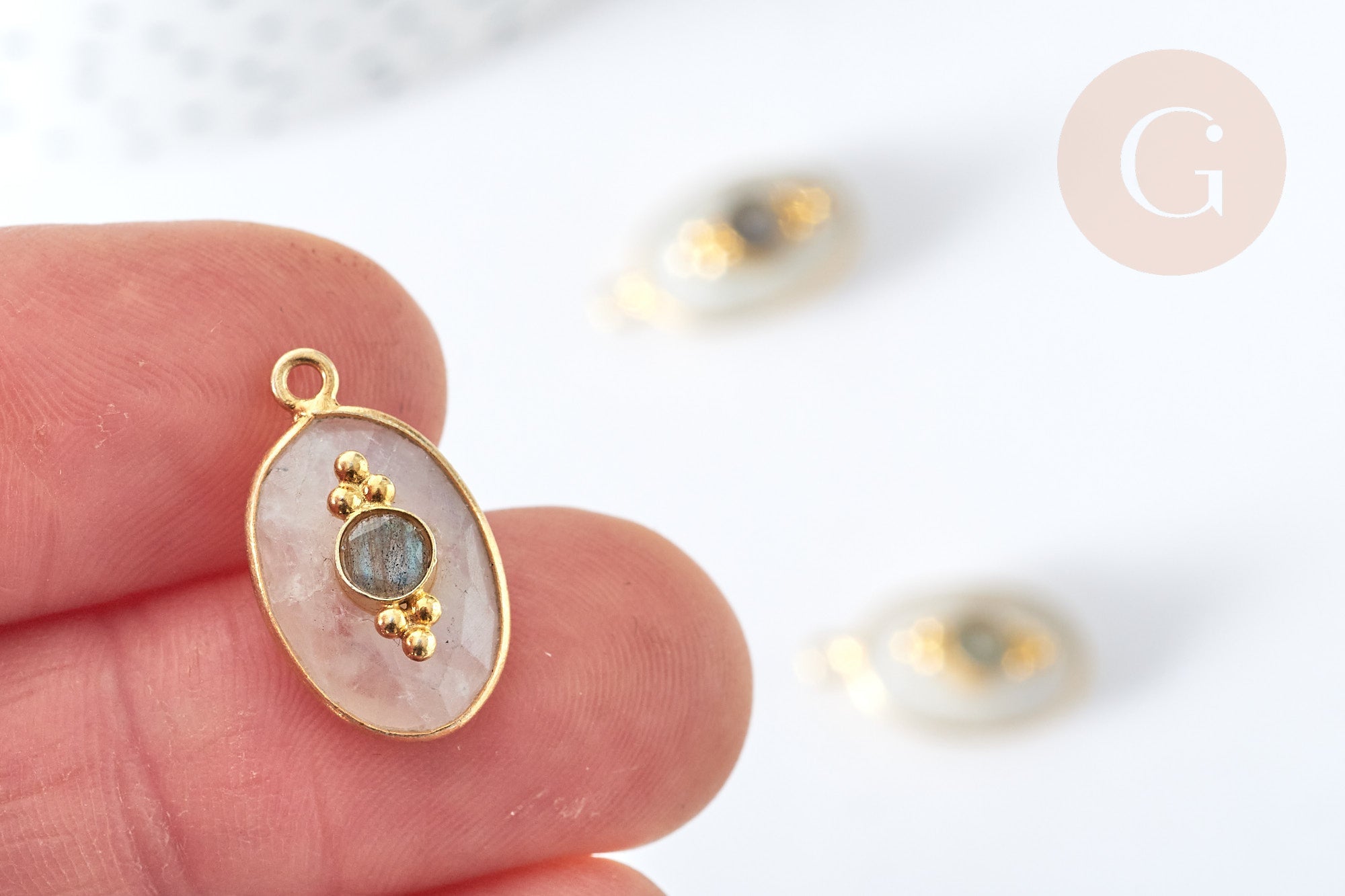 On adopte ce ravissant pendentif amulette en pierre de lune naturelle pour créer des bijoux dans la tendance des pierres naturelle. Il est décoré d'un petit cabochon en labradorite qui lui donne un aspect tendance et original.