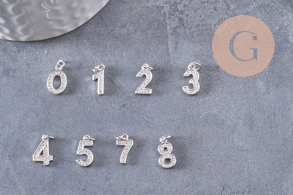 Pendentif platine numéro cristal blanc,pendentif chiffre, pendentif chiffre zircon, sans nickel, numéro porte-bonheur,laiton argenté,11mm