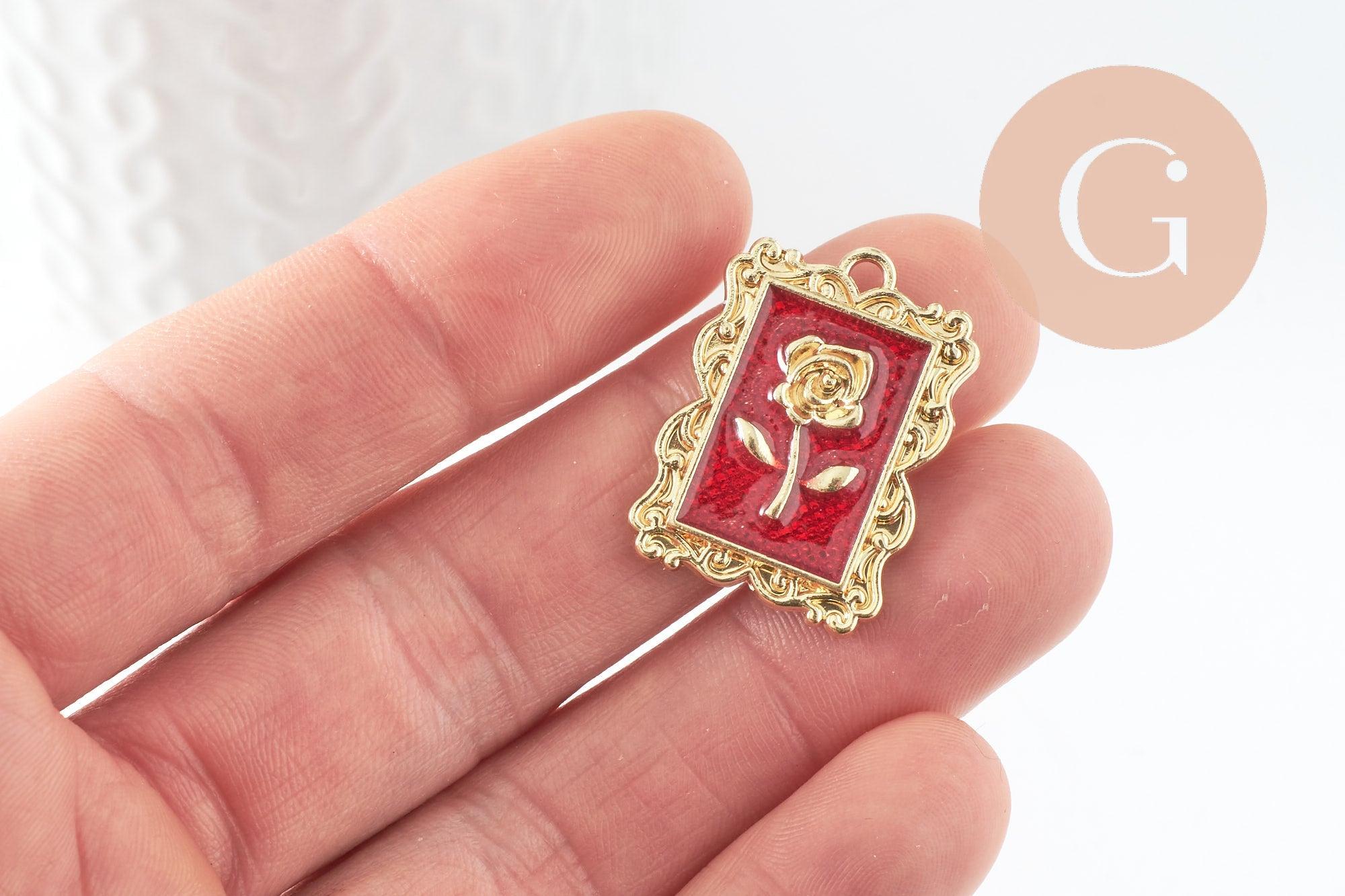 EP-Pendentif rectangle fleur rose émail rouge 27.5mm, x1 (G3713)