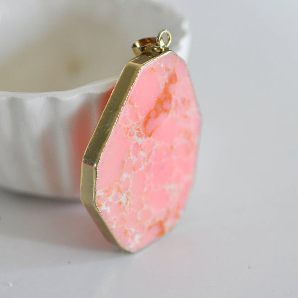 Pendentif regalite rose, fournitures créatives, pierre brute, création bijoux, pendentif doré, pierre naturelle,régalite naturelle Craquez pour ce magnifique pendentif en régalite rose corail teinté avec son support doré. Vous pourrez composer de magnifiques sautoirs en utilisant ce pendentif très tendance....