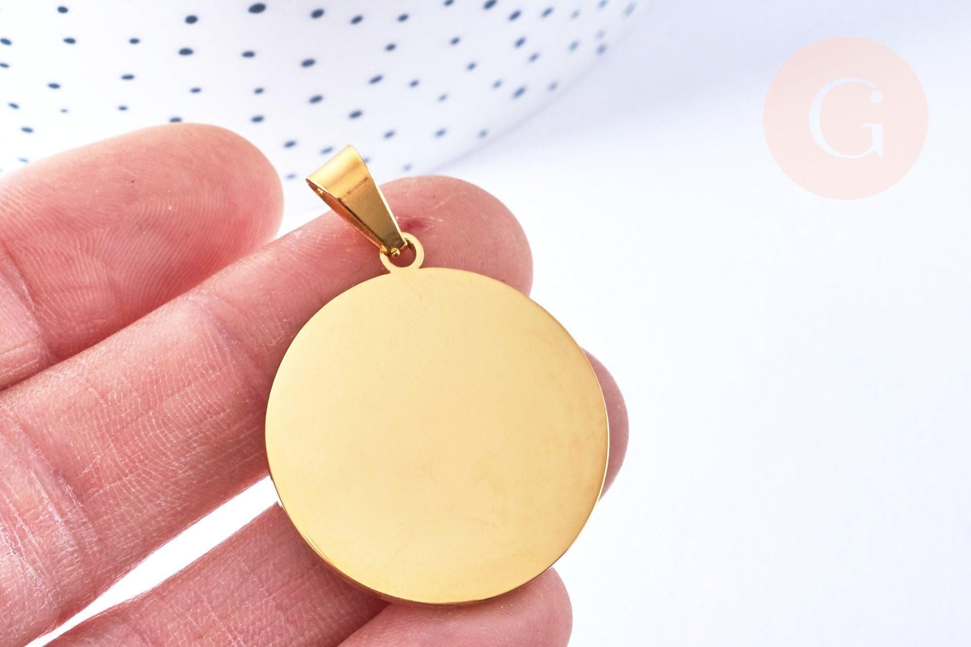 Un pendentif en acier doré inoxydable de forme ronde. Un pendentif doré à utiliser pour vos créations personnalisée, à faire graver pour une occasion.