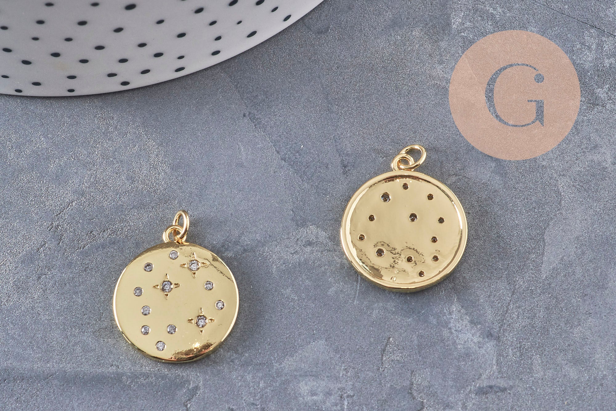 Apportez éclat, modernité et élégance à vos créations avec ce pendentif rond en laiton doré 18K décoré de zircons scintillants . Sa surface lisse rehaussée de détails lumineux en fait une pièce forte, idéale pour composer des bijoux chics, raffinés et faciles à porter au quotidien. Un pendentif à la fois tendance et intemporel, parfait pour sublimer un collier, des boucles d’oreilles ou un bracelet.