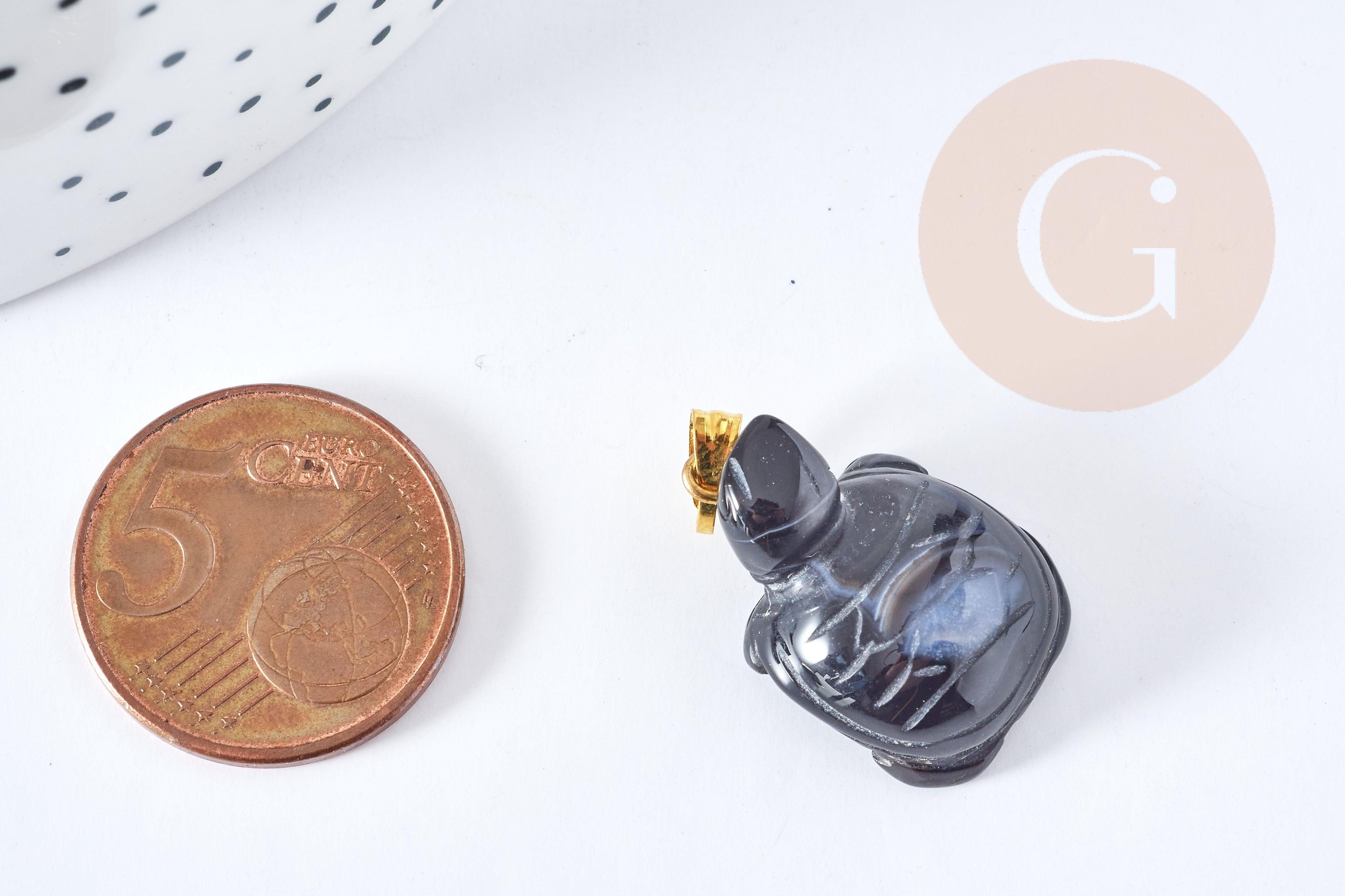 Ce pendentif en forme de tortue est fabriqué à partir d'agate naturelle noire de qualité supérieure, monté sur un support doré.