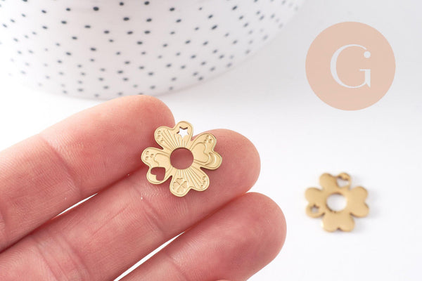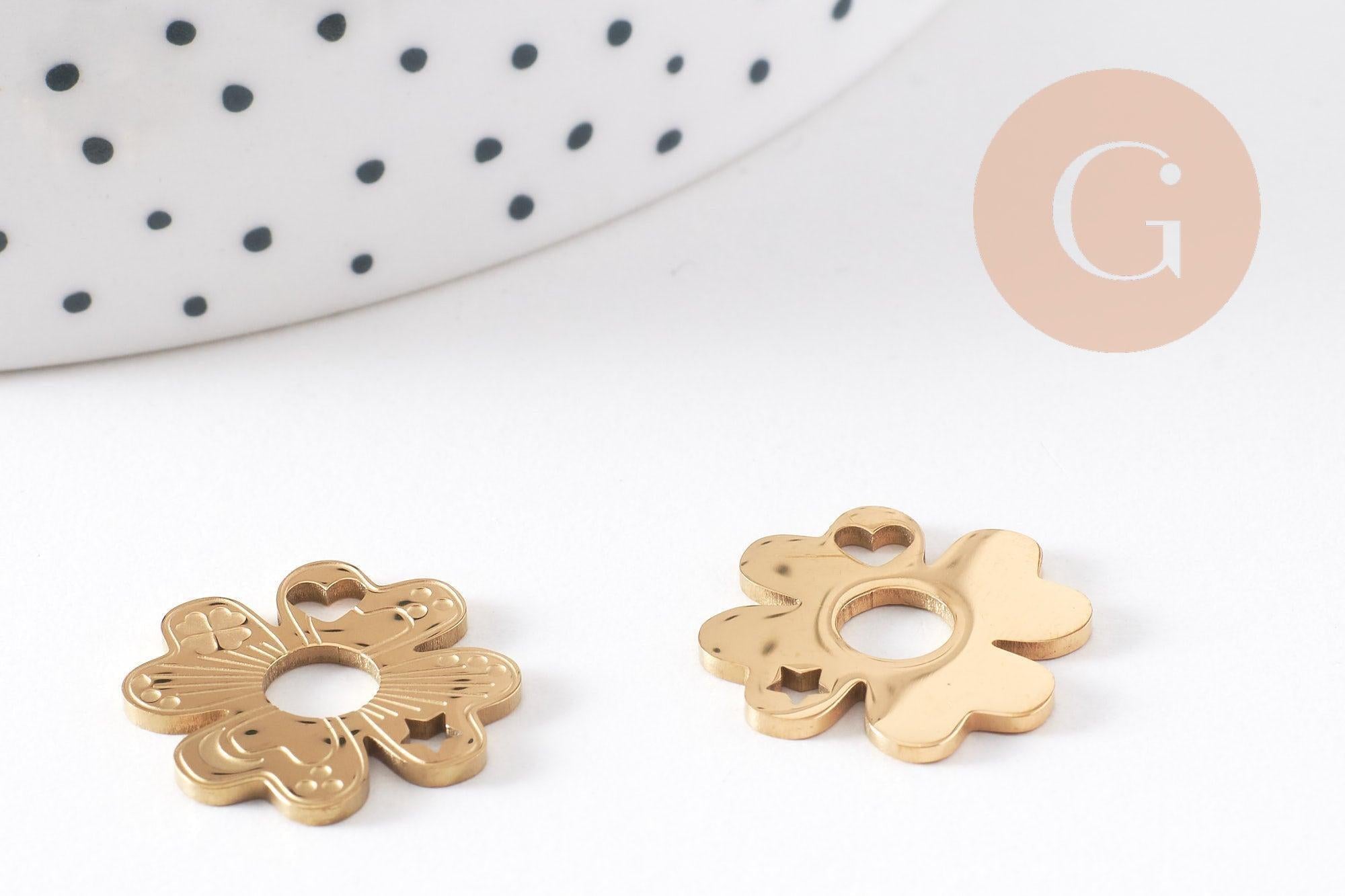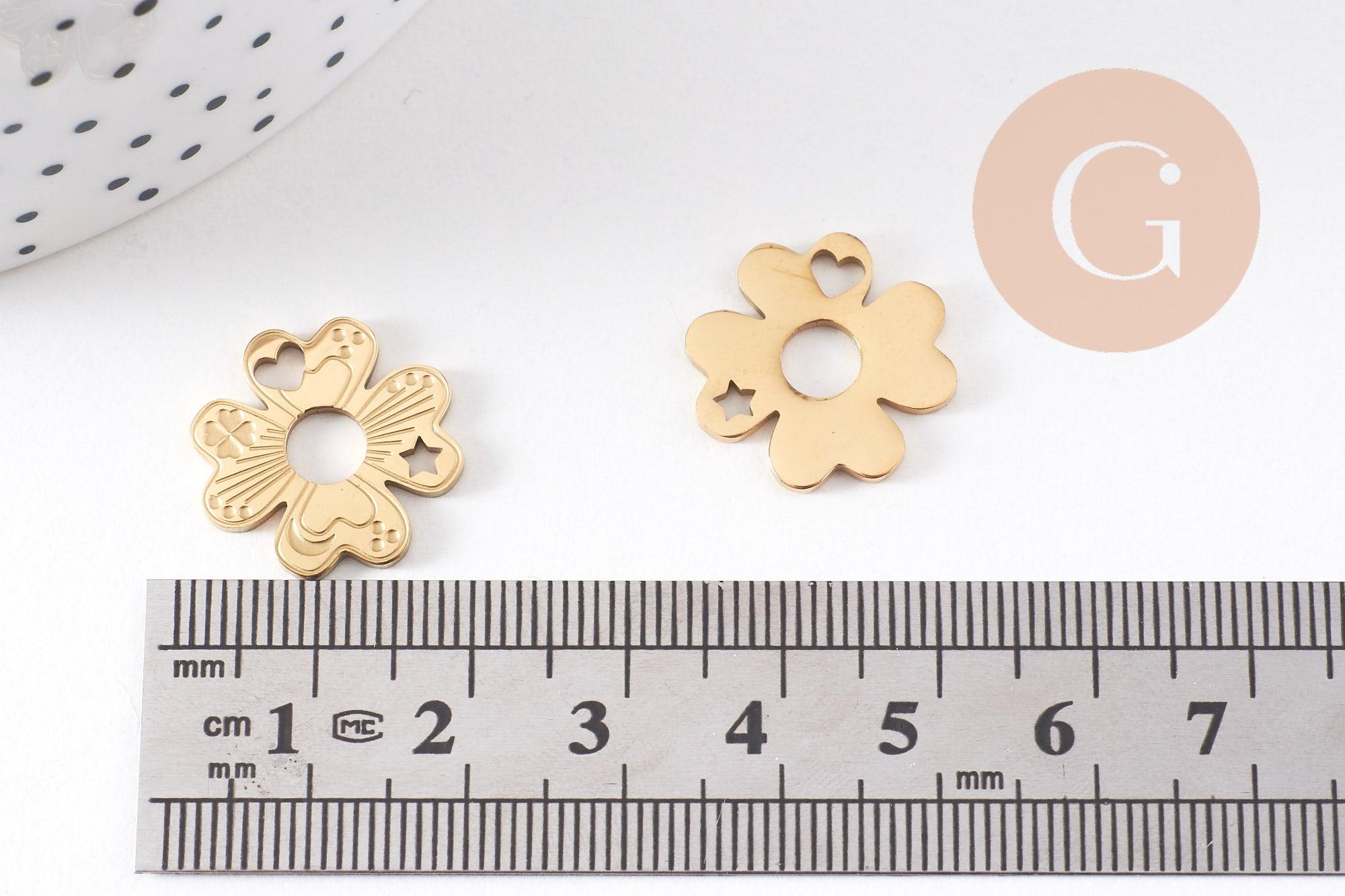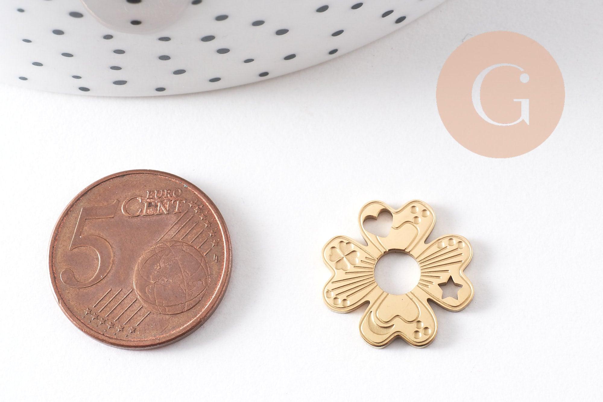 Ce pendentif trèfle à 4 feuilles en acier inoxydable 316 doré IP est orné de motifs finement ajourés représentant des symboles porte-bonheur : cœurs, lunes, étoiles et trèfles. Élégant et raffiné, ce pendentif est idéal pour créer des bijoux symboliques à offrir ou à porter au quotidien comme talisman.